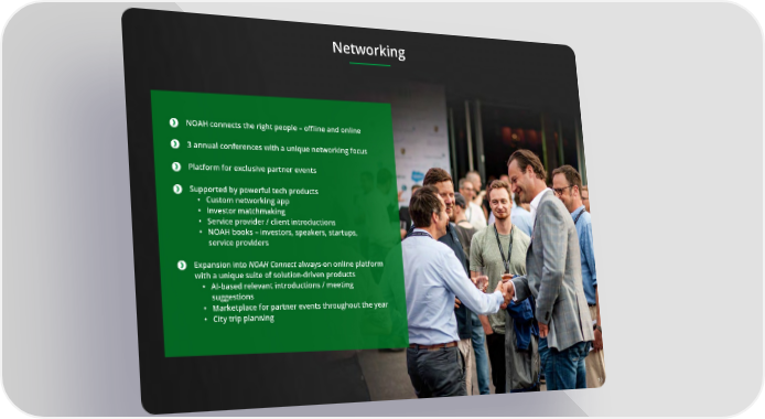 Networking NOAH connects the right people – o昀툀ine and online 3 annual conferences with a unique networking focus Platform for exclusive partner events Supported by powerful tech products • Custom networking app • Investor matchmaking • Service provider / client introductions • NOAH books – investors, speakers, startups, service providers Expansion into NOAH Connect always-on online platform with a unique suite of solution-driven products • AI-based relevant introductions / meeting suggestions • Marketplace for partner events throughout the year • City trip planning 10