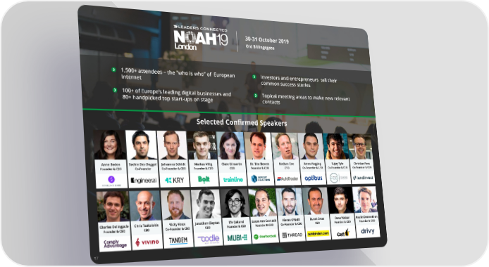 30-31 October 2019 Old Billingsgate 1,500+ attendees – the “who is who” of European Investors and entrepreneurs tell their Internet common success stories 100+ of Europe’s leading digital businesses and Topical meeting areas to make new relevant 80+ handpicked top start-ups on stage contacts Selected Con昀椀rmed Speakers Anne Boden Sachin Dev Duggal Johannes Schildt Markus Villig Clare Gilmartin Dr. Tim Sievers Nathan Coe Amos Haggiag Sujay Tyle Christian Faes Founder & CEO Co-Founder Co-Founder & CEO Founder & CEO CEO Founder & CEO CFO Co-Founder & CEO Co-Founder & CEO Co-Founder & CEO ngineer.ai Charles Delingpole Chris Tsakalakis Ricky Knox Jonathan Clayton Efe Cakarel Lucas von Cranach Kieran O’Neill Burak Ertas Dave Waiser Paulin Dementhon Founder & CEO CEO Co-Founder & CEO CEO Founder & CEO Founder & CEO Co-Founder & CEO CEO Founder & CEO Founder & CEO 17