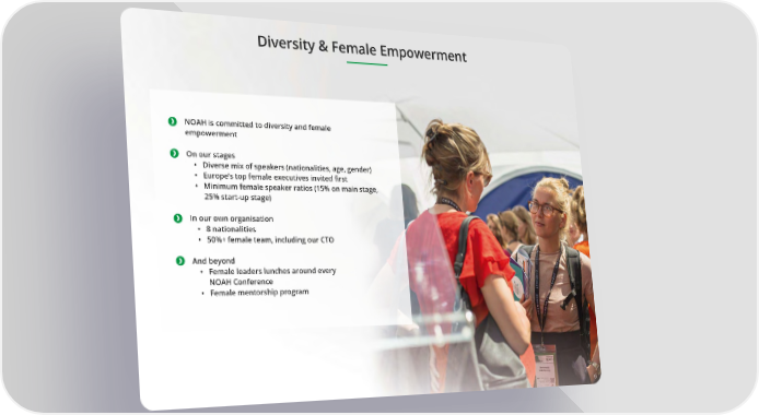 Diversity & Female Empowerment NOAH is committed to diversity and female empowerment On our stages • Diverse mix of speakers (nationalities, age, gender) • Europe’s top female executives invited 昀椀rst • Minimum female speaker ratios (15% on main stage, 25% start-up stage) In our own organisation • 8 nationalities • 50%+ female team, including our CTO And beyond • Female leaders lunches around every NOAH Conference • Female mentorship program 6