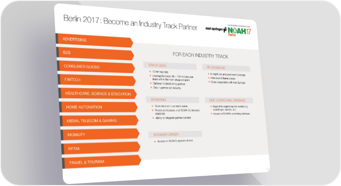 Berlin 2017: Become an Industry Track Partner ADVERTISING B2B FOR EACH INDUSTRY TRACK TRACK LEAD PR COVERAGE CONSUMER GOODS 15 min keynote In-depth pre and post event coverage Leading the track: 90 - 120 minutes per Interviews & theme pieces FINTECH track within the main stage program Close cooperation with Axel Springer Optional moderation by partner Only 1 partner per industry HEALTHCARE, SCIENCE & EDUCATION BRANDING SIDE EVENTS AND DATABASE HOME AUTOMATION Track labelled in partner’s name Support in organizing side events e.g. Prominent features in all NOAH Conference workshops, dinners, etc. materials Access to NOAH’s marketing database MEDIA, TELECOM & GAMING Ability to integrate partner content MOBILITY SPEAKER DINNER Access to NOAH’s speaker dinner RETAIL TRAVEL & TOURISM 17