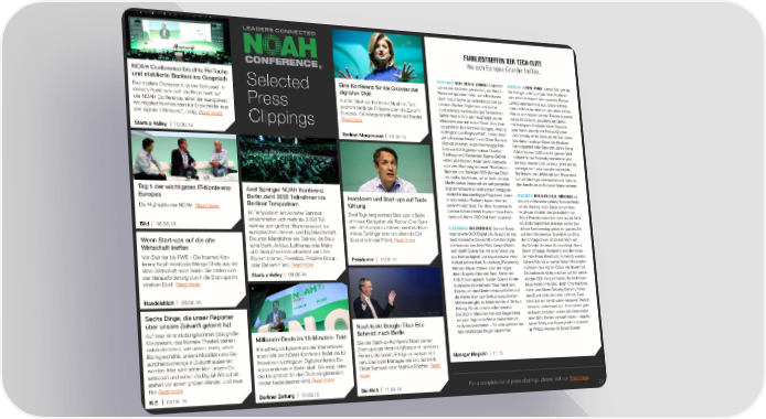 ® NOAH Conference brachte FinTechs Foto: Gregor Fischer / dpa und etablierte Banken ins Gespräch Selected Eine Konferenz für die Gründer der Das digitale Ökosystem ist der Schlüssel. In digitalen Welt diesem Punkt war sich die Finanzwelt auf Press Auf der Start-up-Konferenz Noah im Tem- der NOAH Conference, einer der europaweit podrom berät die IT-Szene über die Zukunft wichtigsten Konferenzen für Entscheider aus Europas. Gründergeist trifft dabei auf Kapital. der digitalen Wirtschaft, einig. Read more Clippings Read more Startup Valley 10.06.16 Berliner Morgenpost 09.06.15 Tag 1 der wichtigsten IT-Konferenz Axel Springer NOAH Konferenz Europas Berlin zieht 3000 Teilnehmer ins Investoren und Start-ups auf Tuch- Die Highlights der NOAH. Read more Berliner Tempodrom fühlung Im Tempodrom am Anhalter Bahnhof Zwei Tage lang werben Start-ups in Berlin Bild 08.06.16 versammelten sich mehr als 3.000 Teil- um neue Geldgeber wie Rocket-Chef Sam- nehmer zum größten Branchenevent der wer. Um Europa zu stärken, sieht EU-Kom- europäischen Internet- und Digitalwirtschaft. missar Oettinger aber vor allem die Old Wenn Start-ups auf die alte Darunter Marktführer wie Daimler, die Deut- Economy in der Pflicht. Read more Wirtschaft treffen sche Bank, Adidas, Lufthansa oder Metro und dirsruptive Herausforderer wie Uber, Von Daimler bis RWE – Die Internet-Kon- Rocket Internet, Freeletics, Priceline Group Potsdamer 10.06.15 ferenz Noah lockt jede Menge Chefs aus der oder Delivery Hero. Read more alten Wirtschaft nach Berlin. Sie stellen sich Startup Valley 09.06.16 der Herausforderung durch die Start-ups im direkten Duell. Read more Handelsblatt 08.06.16 Sechs Dinge, die unser Reporter Foto: REUTERS über unsere Zukunft gelernt hat Auf zwei Veranstaltungsbühnen (das große Noah lockt Google-Titan Eric Colosseum, das kleinere Theater) stehen Millionen-Deals im 15-Minuten- Takt Schmidt nach Berlin dabei die Ideen, wie unser Leben, unser Kreuzberg als Epizentrum der Internetinves- Bei der Start-up-Konferenz Noah stehen Bankgeschäfte, unsere Mobilität oder Ge- toren: Mit der NOAH-Konferenz findet die für Start-ups gar nicht im Mittelpunkt, sondern sundheitsvorsorge in Zukunft aussehen Investoren wichtigsten Digitalkonferenz Eu- Firmen, die bereits Erfolge vorweisen kön- Manager Magazin 11.15 werden. Hier wird sofort klar: unsere Ge- ropas erstmals in Berlin statt. Sie zeigt, dass nen. Das lockt Manager wie Eric Schmidt, sellschaft und selbst die Digital-Wirtschaft die Hauptstadt für den Technologiebereich Oliver Samwer oder Mathias Döpfner. Read stehen vor einem großen Wandel, und zwar immer bedeutsamer wird. Read more more hier Read more B.Z. 08.06.16 Berliner Zeitung 10.06.15 Die Welt 11.05.15 For a complete list of press clippings, please visit our Press page. 24