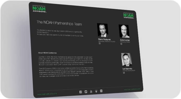 ® ® The NOAH Partnerships Team The NOAH Conference was launched in 2009 and is organised by NOAH Advisors. In case you have any questions, do not hesitate to send us an email. Marco Rodzynek Justus Lumpe Managing Director & Founder Managing Director About NOAH Conference Launched in 2009, the NOAH Conference has grown into the preeminent European event where over 2,000 Internet CEOs, executives and investors gain insights into the latest proven concepts, network and establish new business relationships, while also enjoying the NOAH business networking dinner party. Known for its focus on profitable business models and data, the event is also about interacting with speakers, being inspired, and having fun. From 2015 onwards, NOAH is hosting two conference events in Europe with different underlying Lea Vajnorsky themes. NOAH London in November will be continuing its focus on connecting capital with great entrepreneurs and helping service providers to find relevant customers. NOAH Berlin in June Business Development 2017 presents a unique discussion platform for CEOs and founders from established champions and disruptive challengers across a number of key industry verticals. www.noah-advisors.com www.noah-conference.com