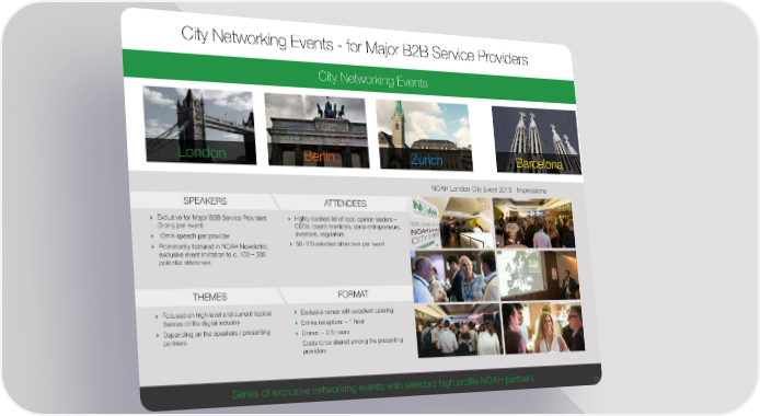 City Networking Events - for Major B2B Service Providers City Networking Events London Berlin Zurich Barcelona NOAH London City Event 2016 - Impressions SPEAKERS ATTENDEES Exclusive for Major B2B Service Providers Highly curated list of local opinion leaders – (3 only per event) CEOs, board members, serial entrepreneurs, 10min speech per provider investors, regulators Prominently featured in NOAH Newsletter, 50-100 selected attendees per event exclusive event invitation to c. 100 – 300 potential attendees THEMES FORMAT Focused on high level and current topical Exclusive venue with excellent catering themes of the digital industry Drinks reception: ~ 1 hour Depending on the speakers / presenting Dinner: ~ 2.5 hours partners Costs to be shared among the presenting providers Series of exclusive networking events with selected high profile NOAH partners 20
