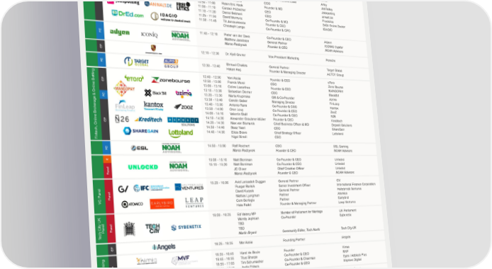MAIN STAGE - Day 2 11 November 2016 SESSION TITLE COMPANY TIME SPEAKER POSITION COMPANY Breakfast 08:00 - 10:00 CP 9:00 - 9:10 Jose Ojeda COO Lyst OnlineFashion 9:10 - 9:20 Ralf Wenzel Founder & CEO foodpanda Online Food CP 9:20 - 9:30 Fabian Siegel Founder & CEO Marley Spoon Delivery 9:30 - 9:40 Efe Cakarel Founder MUBI 9:40 - 9:50 Scott Arpajian CEO Softonic 9:50 - 10:00 Gereon Frahling Founder & CEO Linguee 10:00 - 10:10 Markus Witte CEO Babbel 10:10 - 10:20 Andrea Manfredi Founder & CEO Blasting News 10:20 - 10:30 Asaf Peled Founder & CEO 90min 10:30 - 10:40 Legacy Russell UK Gallery Relations Lead Artsy CP 10:40 - 10:50 Polina Montano COO JobToday 10:50 - 11:00 Robin Eric Haak Founder & MD Jobspotting Online Content 11:00 - 11:10 Carsten Hübscher CEO anwalt.de 11:10 - 11:20 Daniel Sobhani CEO Freeletics 11:20 - 11:30 David Meinertz Co-Founder & MD DrEd Online Doctor 11:30 - 11:45 Till Janczukowicz Founder & CEO IDAGIO Christoph Lange Co-Founder & CPO 11:45 - 12:10 Pieter van der Does Co-Founder & CEO Adyen FC Matthew Jacobson General Partner ICONIQ Capital Marco Rodzynek Founder & CEO NOAH Advisors CP 12:10 - 12:30 Dr. Kjell Gruner Vice President Marketing Porsche 12:30 - 12:40 Shmuel Chafets General Partner Target Global FC Hakan Koç Founder & Managing Director AUTO1 Group 12:40 - 12:50 Yoni Assia Founder & CEO eToro 12:50 - 13:00 Franck Morel CEO Zone Bourse CP 13:00 - 13:10 Celine Lazorthes Founder & CEO MANGOPAY 13:10 - 13:20 Sebastian Diemer CEO BlackBill 13:20 - 13:30 Marta Krupinska GM & Co-Founder Azimo FC 13:30 - 13:40 Carolin Gabor Managing Director FinLeap 13:40 - 13:50 Antonio Rami Co-Founder & COO Kantox okerage & Online Betting 13:50 - 14:00 Oren Levy Co-Founder & CEO ZooZ 14:00 - 14:10 Valentin Stalf Co-Founder & CEO N26 14:10 - 14:20 Alexander Graubner-Müller Founder & CEO Kreditech CP 14:20 - 14:30 Max von Bismarck Chief Business Officer & MD Deposit Solutions 14:30 - 14:40 Boaz Yaari CEO ShareGain 14:40 - 14:50 Elicia Bravo Chief Strategy Officer Lottoland Fintech, Online Br Nigel Birrell CEO 14:50 - 15:00 Ralf Reichert CEO ESL Gaming FC Marco Rodzynek Founder & CEO NOAH Advisors K 15:00 - 15:10 Matt Berriman Co-Founder & CEO Unlockd 15:10 - 15:20 Matt Berriman Co-Founder & CEO Unlockd JC Oliver Chief Creative Officer Unlockd Panel Marco Rodzynek Founder & CEO NOAH Advisors 15:20 - 16:00 Avid Larizadeh Duggan General Partner GV Ruzgar Barisik Senior Investment Officer International Finance Corporation David Kuczek General Partner Holtzbrinck Ventures Panel Mattias Ljungman Partner Atomico VC Panel Cem Sertoglu Partner Earlybird Hala Fadel Founder & Managing Partner Leap Ventures 16:00 - 16:25 Ed Vaizey MP Member of Parliament for Wantage UK Parliament Wendy Jephson Co-Founder Sybenetix PanelPanel TBD ech City UK TBD T Martin Bryant Community Editor, Tech North Tech City UK CP 16:25 - 16:35 Mor Assia Founding Partner iAngels 16:35 - 16:45 Karel de Beule Founder Kimia 16:45 - 16:55 Titus Sharpe Co-Founder & CEO MVF CP 16:55 - 17:05 Tim Schumacher Co-Founder & Chairman Eyeo / Adblock Plus Advertising 17:05 - 17:15 Joelle Frijters Co-Founder & CEO Improve Digital 17:15 - 17:25 Patrick Grove Co-Founder & Group CEO Catcha Group FC Marco Rodzynek Founder & CEO NOAH Advisors net - 17:25 - 17:35 Daniel Sasaki Managing Partner Mayfair Equity Partners InvestingFC Marco Rodzynek Founder & CEO NOAH Advisors Inter CP 17:35 - 17:45 Marie Ekeland Founder & CEO Daphni 17:45 - 17:55 Roxanne Varza Co-Founder & CEO Station F FC Marco Rodzynek Founder & CEO NOAH Advisors 17:55 - 18:10 Edward Shenderovich Managing Director Kite Ventures Marc Beermann Co-Founder Allthings PanelPanel Eugen Miropolski Managing Director WeWork Real EstateInnovation Marco Rodzynek Founder & CEO NOAH Advisors K 18:10 - 18:30 Surprise Guest of Honour Networking Dinner Lunch served between 12:00 - 14:30 K Keynote CP Company Presentation FC Fireside Chat P Panel