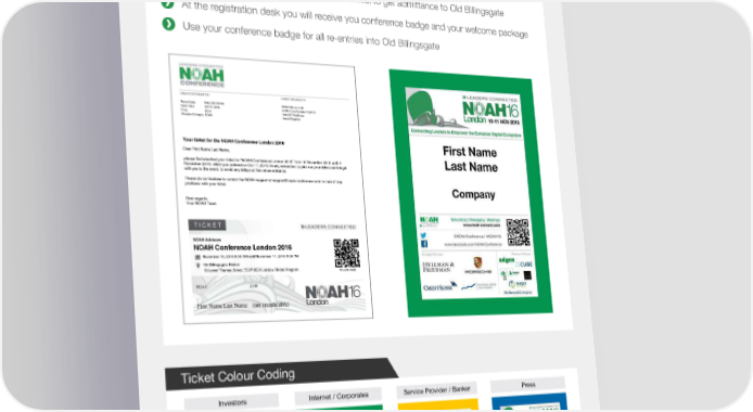 Tickets and Registration Registration Process Print the ticket your received from NOAH or have it ready on your smartphone / tablet Speakers & Sponsors: Upon arrival proceed to the dedicated registration desk Show your ticket at the entrance at your arrival to get admittance to Old Billingsgate At the registration desk you will receive you conference badge and your welcome package Use your conference badge for all re-entries into Old Billingsgate ORDER INFORMATION EVENT ORGANISER Ticket Code: N16-LON-PJKS1 NOAH Advisors Ltd. Order Date: Oct 17, 2016 82 Montrose Avenue, Edgware Price: £0.00 HA8 0DT Middlesex Attendee Category: NOAH United Kingdom Your ticket for the NOAH Conference London 2016 Dear First Name Last Name, please find attached your ticket for "NOAH Conference London 2016" from 10 November 2016 until 11 November 2016, which you ordered on Oct 17, 2016. Kindly remember to print out your ticket and bring it with you to the event, to avoid any delays at the venue entrance. Please do not hesitate to contact the NOAH support at [email protected] in case of any problems with your ticket. Best regards, Your NOAH Team NOAH Advisors NOAH Conference London 2016 November 10, 2016 8:30 AM until November 11, 2016 5:00 PM Old Billingsgate Market 16 Lower Thames Street, EC3R 6DX London, United Kingdom N16-LON-PJKS1 NOAH £0.00 First Name Last Name (not transferable) Ticket Colour Coding Investors Internet / Corporates Service Provider / Banker Press 7
