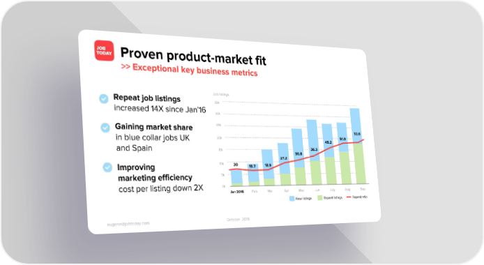 Proven product-market fit >> Exceptional key business metrics Job listings Repeat job listings 35k increased 14X since Jan’16 30k 25k Gaining market share 52.6 20k 51.9 in blue collar jobs UK 45.2 36.3 and Spain 15k 30.8 27.2 10k 20 18.9 18.7 Improving 5k marketing efficiency 0k cost per listing down 2X Jan 2016 Feb Mar Apr May Jun July Aug Sep New listings Repeat listings Repeat ratio eugene@jobtoday.com October 2016