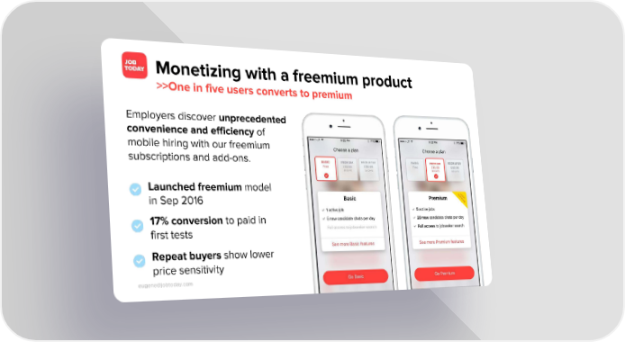 Monetizing with a freemium product >>One in five users converts to premium Employers discover unprecedented convenience and efficiency of mobile hiring with our freemium subscriptions and add-ons. Launched freemium model in Sep 2016 17% conversion to paid in first tests Repeat buyers show lower price sensitivity eugene@jobtoday.com