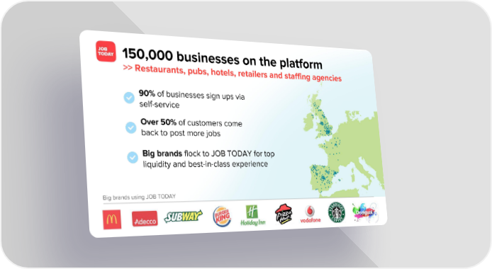 150,000 businesses on the platform >> Restaurants, pubs, hotels, retailers and staffing agencies 90% of businesses sign ups via self-service Over 50% of customers come back to post more jobs Big brands flock to JOB TODAY for top liquidity and best-in-class experience Big brands using JOB TODAY