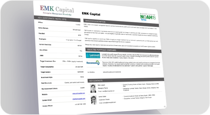 EMK Capital KEY CORPORATE FACTS / KPIS INVESTOR DESCRIPTION Offices London EMK’s vision is to support management teams to achieve transformational growth and to build world class businesses which are leaders in their market. Active Markets UK and Israel EMKfocuses on investments in businesses where we can support growth and change. In partnering with EMK, businesses and management teams get access to more than just capital – we work together to generate ideas on how to take a business forward and act as a catalyst for delivering Founded 2016 change. EMK has the capability to commit over £100m of equity to a single investment from our fund and in partnership with our limited partners we could Employees 14 (of which 14 in Europe) commitfarmoreshouldaportfoliocompanyrequirethatthroughthelifeof aninvestment. Current Fund Size £575m Wetypicallymakemajorityinvestmentsoverperiodsof threeto sevenyears andhaveextensiveexperiencein theEuropeandigitalecosystem. Use of Debt Yes SELECTED PORTFOLIO COMPANIES Luminati is the world’s largest IP proxy network, and helps make the Web more transparent by allowing businesses AUM £873m to see the internet from the consumer’s point of view. Luminati’s technology and patent portfolio allow it to operate the only mass-scale residential IP proxy network in the world. Target Investment Size £20m - £100m (equity investment) Reconomy is the UK’s market-leading technology enabled outsourced recycling and resource management services company. Reconomy has enjoyed significant growth fuelled by a relentless focus on driving innovation in the waste Target Geographies UK and RoW industry; including the development of an advanced IT platform and customer / supplier mobile apps Target Sectors Generalist Full Portfolio www.emkcapital.com/investments Investment Style Active Deal Structures Control, joint control and minority KEY CONTACTS Mark Joseph • Formerly Founding Partner at Oakley Capital, Managing Director at UBS, Key Investment Criteria Growth Managing Partner PWC • Companies: Luminati, Parship, Facile, Educas, Verivox, Intergenia, Host Website www.emkcapital.com Email: [email protected] Europe etc Contact Email [email protected] Simon Dexter • Formerly Investment Director at Oakley Capital, HSBC, KPMG Investment Director • Companies: Luminati, Parship, Intergenia, Host Europe Contact Phone +44 207 591 4200 Email: [email protected] 48