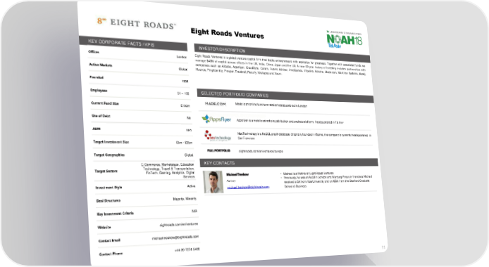 Eight Roads Ventures KEY CORPORATE FACTS /KPIS INVESTORDESCRIPTION KEY CORPORATE FACTS / KPIS INVESTOR DESCRIPTION Offices London Eight Roads Ventures is a global venture capital firm that backs entrepreneurs with aspiration for greatness. Together with associated funds we manage $4BN of capital across offices in the UK, India, China, Japan and the US. A near 50-year history of investing includes partnerships with companies such as Alibaba, Appsflyer, CloudByte, Cúram, Future Advisor, InnoGames, iPipeline, Kensho, Made.com, Manthan Systems, Neo4j, Active Markets Global Nuance,PingIdentity,Prosper,Treatwell,Recurly,WallapopandXoom. Founded 1998 Employees 51 – 100 SELECTED PORTFOLIO COMPANIES Current Fund Size £150m MadeisanonlinefurnitureretailerheadquarteredinLondon Use of Debt No SELECTED PORTFOLIOCOMPANIES Appsflyer isamobileadvertisingattributionandanalysisplatform.HeadquarteredinTelAviv AUM N/A NeoTechnologyisaNoSQLgraphdatabase.OriginallyfoundedinMalmo,thecompanyiscurrentlyheadquartered in SanFrancisco Target Investment Size £5m - £25m FULLPORTFOLIO eightroads.com/en/ventures/europe Target Geographies Global KEY CONTACTS E-Commerce, Marketplace, Education KEYCONTACTS Target Sectors Technology, Travel & Transportation, FinTech, Gaming, Analytics, Digital MichaelTreskow • MichaelisaPartneratEightRoadsVentures Services • Previously,hewasatAccelinLondonandWarburgPincusinFrancisco.Michael Partner received a BA from Yale University and an MBA from the Stanford Graduate Investment Style Active [email protected] School ofBusiness Deal Structures Majority, Minority Key Investment Criteria N/A Website eightroads.com/en/ventures Contact Email [email protected] Contact Phone +44 20 7074 5400 11