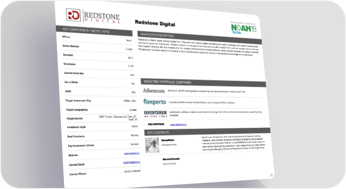 Redstone Digital KEY CORPORATE FACTS /KPIS INVESTORDESCRIPTION KEY CORPORATE FACTS / KPIS INVESTOR DESCRIPTION Offices Berlin Redstone is a Berlin based Venture Capital firm. They work with industry leaders activating their capital, knowledge and network enabling entre- preneurs to grow their businesses. Redstone believes in transparent and fast communication between the funds we manage and the start-ups they support. Working with the investors the firm enables entrepreneurs to access additional valued services alongside any capital investment. Active Markets Europe Theapproachinvolvesinvestingfrom severalfundssimultaneouslytosupportourvisiontoinvestgloballyateverystageandineverysector Founded 2014 Employees 11-25 Current Fund Size N/A SELECTED PORTFOLIOCOMPANIES Use of Debt Yes SELECTED PORTFOLIO COMPANIES AUM N/A atheneum-World‘sleadingexperts,empoweringnewbusinessdecisions.Lastfundraise€10m Target Investment Size €500k - €2m Flexpertobuildsthecentralinterfacebetweenyourcompanyandthecustomers Target Geographies Europe Inventorum’s software enables small retailers to manage their offline and online businesses by supporting daily Target Sectors B2B, Fintech, Cybersecurity Data, IoT, processes SaaS, AI Investment Style Active FULLPORTFOLIO www.redstone.vc/ KEYCONTACTS Deal Structures Minority KEY CONTACTS SamueliSiren • Samuli is an entrepreneur who has founded several companies including Key Investment Criteria Top team Redstone. Post-university he started a company syndicating financial data for ManagingPartner internetportalsandbanks.HethenfoundedM&ABoutiqueFinfortecwherehe spent several years gaining experience in later stage and buy-out deals. Before Website www.restone.vc becomingtheManagingDirectoratRedstoneheworkedfortheKlingelGroup. Contact Email [email protected] MarcusSchroeder Venture Partner Contact Phone +49 30 27590487 32