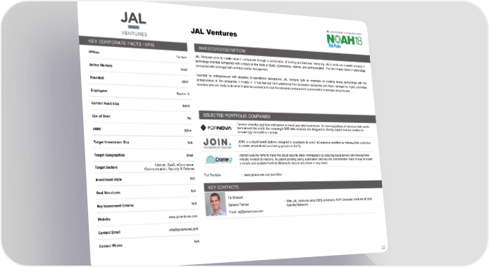 JAL Ventures KEY CORPORATE FACTS / KPIS INVESTOR DESCRIPTION Offices Tel Aviv JAL Ventures aims to create value in companies through a combination of funding and business mentoring. JAL’s funds are invested primarily in technology-oriented companies with a focus on the fields of SaaS, eCommerce, internet, and communication. The firm invests mainly in early-stage companieswithstronggrowthandtop-qualitymanagement. Active Markets Israel Founded by entrepreneurs with decades of operational background, JAL Ventures puts an emphasis on creating strong partnerships with the Founded 2004 entrepreneurs of the companies it invests in. It has learned from experience that successful companies are those managed by highly committed founderswho arereadyto dowhatit takesto succeedandhavethenecessaryenduranceto overcomethechallengesalongtheway. Employees Approx. 5 Current Fund Size $60m Use of Debt No SELECTED PORTFOLIO COMPANIES Fornova provides real-time intelligence to travel and retail businesses. By scanning billions of exclusive data points AUM $60m from around the world, the company’s B2B data solutions are designed to directly impact revenue creation in increasingly competitive markets. Target Investment Size N/A JOIN. is a cloud-based platform designed to accelerate its users’ eCommerce activities by enticing their customers to create personalized purchasing groups on the fly. Target Geographies Israel Dome9 Security aims to make the cloud-security stack manageable by securing cloud servers and making them virtually invisible to hackers. Its patent-pending policy automation and security centralization make it easy to create Target Sectors Internet, SaaS, eCommerce, a simple and scalable frontline defense to secure any server in any cloud. Communication, Security & Defense Investment Style N/A Full Portfolio • www.jalventures.com/portfolio/ Deal Structures N/A KEY CONTACTS Tal Shaked Key Investment Criteria N/A General Partner • With JAL Ventures since 2003, previously AVP Corporate Ventures at Gilat Satellite Networks Website www.jalventures.com Email: tal@jalventures.com Contact Email info@jalventures.com Contact Phone N/A 22