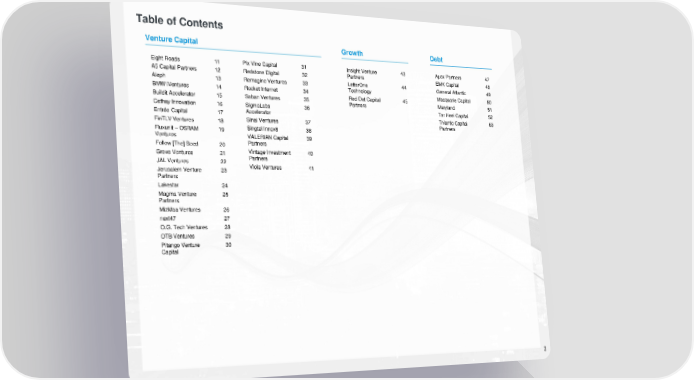 Table of Contents Venture Capital Growth Debt Eight Roads 11 Pix Vine Capital 31 Insight Venture 43 Apax Partners 47 A5 Capital Partners 12 Redstone Digital 32 Partners EMK Capital 48 Aleph 13 Remagine Ventures 33 LetterOne 44 General Atlantic 49 BMW iVentures 14 Rocket Internet 34 Technology Macquarie Capital 50 Buildit Accelerator 15 Saban Ventures 35 Red Dot Capital 45 Maryland 51 SigmaLabs 36 Partners Cathay Innovation 16 Tar Heel Capital 52 Entrée Capital 17 Accelerator Trilantic Capital 53 FinTLV Ventures 18 Sinai Ventures 37 Partners Fluxunit – OSRAM 19 Singtel Innov8 38 Ventures VALERIAN Capital 39 Follow [The] Seed 20 Partners Grove Ventures 21 Vintage Investment 40 JAL Ventures 22 Partners Jerusalem Venture 23 Viola Ventures 41 Partners Lakestar 24 Magma Venture 25 Partners MizMaa Ventures 26 next47 27 O.G. Tech Ventures 28 OTB Ventures 29 Pitango Venture 30 Capital 3