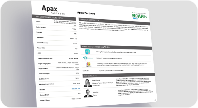 ApaxPartners KEY CORPORATE FACTS / KPIS INVESTOR DESCRIPTION London, Barcelona, New York, Hong Kong, With over $40 billion raised over the last 30 years, Apax Funds have a proven strategy of sector focused investing, looking for opportunities where Offices Munich, Mumbai, Sao Paolo, Shanghai, Tel capital, experience and insight can release the potential of businesses and lead to significant growth. Our sector focus, combined with an established Aviv network of local offices and a global platform, represents the foundation of Apax Partners' strategy. Currently, the portfolio companies in which our Active Markets Global fundsinvestemployinexcessof270,000andhaveanenterprisevalueinexcessof€72billion. Founded 1969 Employees Approx. 100 Current Fund Size $7.5bn SELECTED PORTFOLIO COMPANIES Use of Debt Yes SoYoung: The largest online marketplace for aesthetic medical treatments in China AUM $40bn Target Investment Size €200m - €500m Leading B2B travel technology and service provider Target Geographies North America, Europe, Brazil, India, The leading consumer internet business in Israel with the largest digital yellow pages, largest online price China comparison and several other leading specialized websites including Rest, Doctors and Mitchatnim. Target Sectors Consumer. Healthcare, Services, Tech & Telco Full Portfolio • http://www.apax.com/investments/all-investments/ Investment Style Active KEY CONTACTS Deal Structures Control Zehavit Cohen • Joined Apax in 2006. Prior to joining Apax Partners, Zehavit was Deputy Key Investment Criteria Sector focus Director General of IDB Holdings and Chief Financial Officer of the IDB Managing Partner / Office Head of Apax Group. In the past, she served as VP at Chase Manhattan Bank and was a Partners Irael part of the International Department of Mergers and Acquisitions at the Website www.apax.com international accounting firm Coopers & Lybrand. Contact Email N/A Shay Aba • Joined Apax in 2008. Prior to joining Apax Partners, Shay was an investment banker with Morgan Stanley and Bear Stearns in New York Partner where he specialised in advising industrial companies on capital raising and Contact Phone +44 207 872 6380 mergers and acquisitions. 47