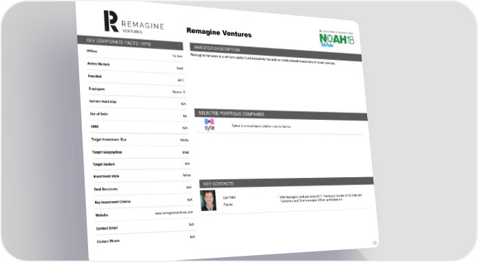 Remagine Ventures KEY CORPORATE FACTS / KPIS INVESTOR DESCRIPTION Offices Tel Aviv RemagineVenturesis a venturecapital fund exclusively focused on media related investments in Israeli startups. Active Markets Israel Founded 2017 Employees Approx. 5 Current Fund Size N/A Use of Debt No SELECTED PORTFOLIO COMPANIES AUM N/A Syte.ai is a visual search platform only for fashion. Target Investment Size Media Target Geographies Israel Target Sectors N/A Investment Style Active Deal Structures N/A KEY CONTACTS Key Investment Criteria N/A Eze Vidra • With Remagine Ventures since 2017. Previously Founder of VC Cafe and Partner Techbikers and Chief Innovation Officer at Antidote.me Website www.remagineventures.com Contact Email N/A Contact Phone N/A 33