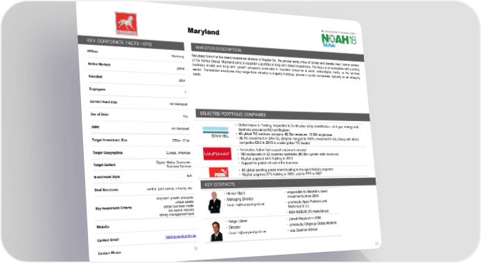 Maryland KEY CORPORATE FACTS / KPIS INVESTOR DESCRIPTION Offices Hamburg Maryland GmbH is the direct investment division of Mayfair SE, the private family office of Günter and Daniela Herz, former owners of the Tchibo Group. Maryland aims to establish a portfolio of long-term direct investments. The focus is on companies with a strong business model and long-term growth prospects preferably in branded consumer & retail, online/digital media, or the services Active Markets global sector. Transaction structures may range from minority to majority holdings, private or public companies, typically on an all-equity basis. Founded 2004 Employees 7 Current Fund Size not disclosed Use of Debt Yes SELECTED PORTFOLIO COMPANIES • Global leader in Testing, Inspection & Certification (ship classification, oil & gas, energy and AUM not disclosed business assurance/ISO certification) • #3 global TIC services company, €2.5bn revenues, 13,500 employees Target Investment Size €50m - €1bn • 36.5% investment in DNV-GL (Mayfair merged its 100% investment in GL Group with direct competitor DNV in 2013 to create global TIC leader) Target Geographies Europe, Americas • Innovative, Italian fast-casual restaurant concept • 180 restaurants in 32 countries worldwide (€0.5bn system-wide revenues) Digital, Media, Consumer, • Mayfair acquired 44% holding in 2011 Target Sectors Business Services • Support for global roll-out of the business • #3 global sporting goods brand leading in the sport lifestyle segment Investment Style N/A • Mayfair acquired 27% holding in 2005; sold to PPR in 2007 Deal Structures control, joint control, minority, etc. KEY CONTACTS long-term growth prospects • Hinrich Stahl • responsible for Mayfair’s direct unique assets • Managing Director investments since 2004 Key Investment Criteria global business model • Email: hs@maryland-gmbh.de • previously Apax Partners and low capital intensity McKinsey & Co. strong management team • MBA INSEAD (Fontainebleau) Website • Helge Lützen • joined Maryland in 2008 • Director • previously Citigroup Global Markets Contact Email hl@maryland-gmbh.de • Email: hl@maryland-gmbh.de • ebs Oestrich-Winkel Contact Phone [ ] 51