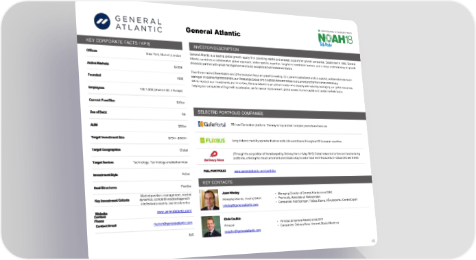 General Atlantic KEY CORPORATE FACTS /KPIS INVESTORDESCRIPTION KEY CORPORATE FACTS / KPIS INVESTOR DESCRIPTION Offices New York, Munich,London General Atlantic is a leading global growth equity firm providing capital and strategic support for growth companies. Established in 1980, General Atlantic combines a collaborative global approach, sector-specific expertise, long-term investment horizon, and a deep understanding of growth driverstopartnerwith greatmanagementandbuildexceptionalbusinessesworldwide. ActiveMarkets Global Theirthreemaindifferentiatorsare(i)theexclusivefocusongrowthinvesting,(ii)apatientcapitalbaseand(iii)aglobal,collaborativeteamcon- Founded 1980 sistingof investmentprofessionals,ourResourcesGroupandaSpecialAdvisorsnetworkofcurrentandformerseniorexecutives. While most of our investments are minorities, General Atlantic is an active investor who steadily add value by leveraging our global resources, helpingourcompanieswith growthacceleration,performanceimprovement,globalaccess,humancapitalandcapitalmarketstopics. Employees 100-1,000(ofwhich30inEurope) Current FundSize $10bn SELECTED PORTFOLIOCOMPANIES Use ofDebt No SELECTED PORTFOLIO COMPANIES AUM $20bn 2BLeadGenerationplatform.Thewaytobuyandsellcomplexproductsandservices Target InvestmentSize $25m -$500m Longdistancemobilityoperatorthatconnectscitiesandtownsthroughout20Europeancountries TargetGeographies Global (ThroughtheacquisitionofYemeksepetibyDeliveryHeroinMay2015)Globalnetworkofonlineandfoodordering platforms,offeringthemostconvenientandreliablewaytoorderfoodfromthousandsofrestaurantsworldwide TargetSectors Technology, Technology-enabledservices InvestmentStyle Active FULLPORTFOLIO www.generalatlantic.com/portfolio KEYCONTACTS DealStructures Flexible KEY CONTACTS Marketposition,management,market JoernNikolay • ManagingDirectoratGeneralAtlanticsince2008. KeyInvestmentCriteria dynamics, competitiveadvantage with Managing Director, Head ofDACH • Previously, Associate at TAAssociates intellectualproperty,barrierstoentry • Companies: Axel Springer, FlixBus, Klarna, Käuferportal, ControlExpert [email protected] Website www.generalatlantic.com/ Contact Phone ChrisCaulkin ContactEmail [email protected] • PrincipalatGeneralAtlanticsince2011 Principal • Companies:DeliveryHero,Hemnet,StudioModerna N/A [email protected] 49