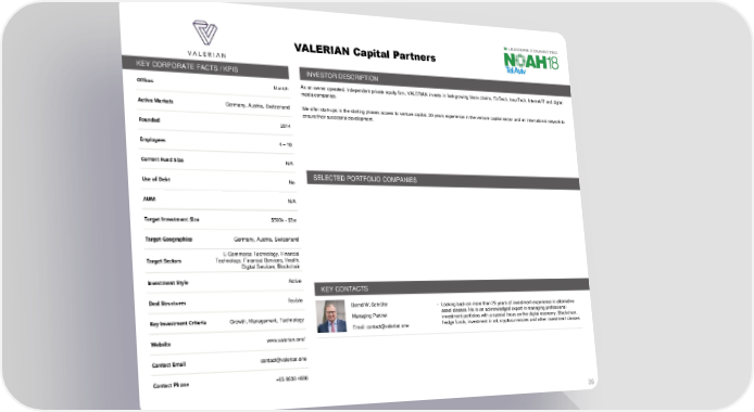 VALERIAN Capital Partners KEY CORPORATE FACTS / KPIS INVESTOR DESCRIPTION Offices Munich As an owner operated, independent private equity firm, VALERIAN invests in fast-growing block chains, FinTech, InsurTech, Internet/IT and digital mediacompanies. Active Markets Germany, Austria, Switzerland Weoffer start-ups in the starting phases access to venture capital, 20 years experience in the venture capital sector and an international network to ensuretheirsuccessfuldevelopment. Founded 2014 Employees 4 – 10 Current Fund Size N/A Use of Debt No SELECTED PORTFOLIO COMPANIES AUM N/A Target Investment Size $500k - $3m Target Geographies Germany, Austria, Switzerland E-Commerce Technology, Financial Target Sectors Technology, Financial Services, Health, Digital Services, Blockchain Investment Style Active KEY CONTACTS Deal Structures flexible Bernd W. Schrüfer • Looking back on more than 25 years of investment experience in alternative Key Investment Criteria Growth, Management, Technology Managing Partner asset classes. He is an acknowledged expert in managing professional investment portfolios with a special focus on the digital economy, Blockchain, Email: [email protected] hedge funds, investment in art, cryptocurrencies and other investment classes Website www.valerian.one/ Contact Email [email protected] Contact Phone +65 6838 4686 39