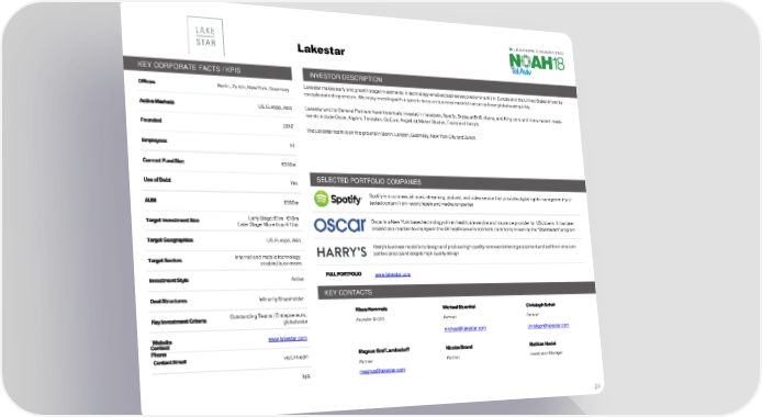Lakestar KEY CORPORATE FACTS /KPIS INVESTORDESCRIPTION KEY CORPORATE FACTS / KPIS INVESTOR DESCRIPTION Offices Berlin, Zurich, NewYork, Guernsey Lakestarmakesearlyandgrowthstageinvestmentsintechnology-enabledbusinessespredominantlyinEuropeandtheUnitedStatesdrivenby exceptionalentrepreneurs.Weenjoyinvestingwith aspecificfocusonbusinessmodelsthatcanachieveglobalscalequickly. ActiveMarkets US, Europe,Asia Lakestar and its General Partners have historically invested in facebook, Spotify, Skype, airBnB, klarna, and King.com, and more recent invest- mentsincludeOscar,Algomi,Teralytics,GoEuro,AngelList,MakerStudios,TauliaandHarry’s. Founded 2012 TheLakestarteamisonthegroundinBerlin,London,Guernsey,NewYorkCityandZurich. Employees 14 Current FundSize €350m SELECTED PORTFOLIOCOMPANIES Use ofDebt Yes SELECTED PORTFOLIO COMPANIES Spotify is a commercial music streaming, podcast, and video service that provides digital rights management–pro- AUM tectedcontentfromrecordlabelsandmediacompanies €500m Target InvestmentSize Early Stage: €1m-€10m OscarisaNewYorkbasedtechnology-drivenhealthcareserviceandinsuranceproviderfor UScitizens.It hasbeen LaterStage:Morethan€10m createdasareactiontochangesintheUShealthcareenvironment,commonlyknownasthe“Obamacare”program TargetGeographies US, Europe,Asia Harry’sbusinessmodelistodesignandproducehigh-qualityrazorsandshavingequipmentandsellthematacom- Internetandmobiletechnology petitiveprice point despitehigh-qualitydesign TargetSectors enabledbusinesses InvestmentStyle Active FULLPORTFOLIO www.lakestar.com KEYCONTACTS DealStructures MinorityShareholder KEY CONTACTS Outstanding Teams /Entrepreneurs, KlausHommels MichaelStuenkel ChristophSchuh Key InvestmentCriteria globalscale Founder &CEO Partner Partner Website www.lakestar.com michael@lakestar.com christoph@lakestar.com Contact Phone Magnus GrafLambsdorff NicolasBrand MathiasHaniel ContactEmail viaLinkedin Partner Partner Investment Manager N/A magnus@lakestar.com 24