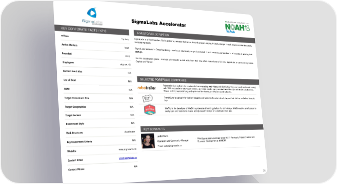 SigmaLabs Accelerator KEY CORPORATE FACTS / KPIS INVESTOR DESCRIPTION Offices Tel Aviv SigmaLabs is a ‘For Founders. By Founders’ accelerator that runs a 4-month program helping 4-6 early startups in each program accelerate to early success,noequity. Active Markets Israel SigmaLabs believes in Deep Mentoring - we focus extensively on product/market fit and mentoring co-founders in all aspects of growing their startups. Founded 2015 For the acceleration period, start-ups will relocate to and work from their new office space Sarona Tel Aviv. SigmaLabs is sponsored by Entrée Capital andYahoo!. Employees Approx. 15 Current Fund Size N/A Use of Debt N/A SELECTED PORTFOLIO COMPANIES Robotrailer is a platform for creating trailers promoting web videos and distributing them on social media and in paid AUM N/A ads. With robotrailer's web-scale system, any video creator can promote their video clips with trailers that are six, fifteen, or thirty seconds long and optimized for sharing on different social networks. Target Investment Size N/A TrendiGuru is a plug-in for fashion bloggers and websites to automatically tag and link clothing and other items to buy. Target Geographies N/A WeTripis the developer of WeSki, a professional booking platform for ski holidays. WeSki enables small groups to easily plan and book tailor-made, activity-based holidays on a dedicated web app. Target Sectors N/A Investment Style N/A Deal Structures Accelerator KEY CONTACTS Leetal Oknin Key Investment Criteria N/A Operation and Community Manager • With SigmaLabs Accelerator since 2017. Previously Project Director and Business Development at MAROM. Website www.sigmalabs.co Email: leetal@sigmalabs.co Contact Email info@sigmalabs.co Contact Phone N/A 36