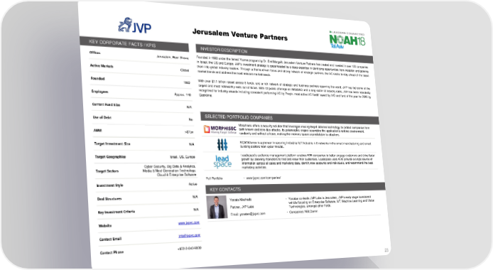 Jerusalem Venture Partners KEY CORPORATE FACTS / KPIS INVESTOR DESCRIPTION Offices Jerusalem, Beer Sheva Foundedin1993 under the famed Yozma program byDr. Erel Margalit, Jerusalem Venture Partners has created and invested in over 120 companies in Israel, the US and Europe. JVP’s investment strategy is spearheaded by a deep expertise in identifying opportunities from inception and growing them into global industry leaders. Through a theme-driven focus and strong network of strategic partners, the VC seeks to stay ahead of the latest Active Markets Global markettrendsandaddressthemostrelevantmarketneeds. Founded 1993 With over $1.1 billion raised across 8 funds, and a rich network of strategic and business partners spanning the world, JVP has led some of the largest and most noteworthy exits out of Israel. With 12 public offerings on NASDAQ and a long roster of industry sales, JVP has been repeatedly recognized for industry awards including consistent performing VC by Preqin, most active VC funds’ award by IVC and fund of the year for 2016 by Employees Approx. 140 Geektime. Current Fund Size N/A Use of Debt No SELECTED PORTFOLIO COMPANIES Morphisec offers a security solution that leverages moving-target defense technology to protect companies from AUM >$1bn both known and zero-day attacks. Its polymorphic engine scrambles the application’s runtime environment, randomly and without a trace, making the memory space unpredictable to attackers. Target Investment Size N/A SCADAfenceis a pioneer in securing Industrial IoT/Industrie 4.0 networks in the smart manufacturing and smart building sectors from cyber threats. Target Geographies Israel, US, Europe Leadspace's audience management platform enables B2B companies to better engage customers and drive faster growth by allowing marketers to find and know their audiences. Leadspace uses AI to provide a single source of Cyber Security, Big Data & Analytics, information across all sales and marketing data, identify new accounts and individuals, and recommend the best Target Sectors Media & Next Generation Technology, marketing activities. Cloud & Enterprise Software Full Portfolio • www.jvpvc.com/companies/ Investment Style Active KEY CONTACTS Deal Structures N/A Yonata Machado • Yonatan co-leads JVP Labs in Jerusalem, JVP’s early stage investment Partner, JVP Labs vehicle focusing on Enterprise Software, IoT, Machine Learning and Vision Key Investment Criteria N/A Technologies, amongst other fields. Email: yonatan@jvpvc.com • Companies: NSLComm Website www.jvpvc.com Contact Email info@jvpvc.com Contact Phone +972-2-640-9000 23