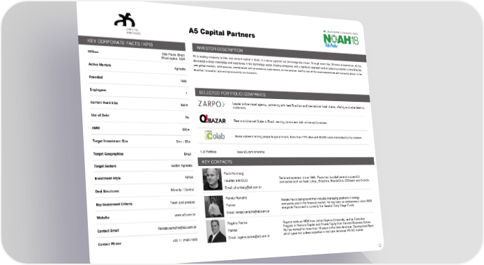 A5 Capital Partners KEY CORPORATE FACTS / KPIS INVESTOR DESCRIPTION Offices SãoPaulo, Brazil A5 is leading company builder and venture capital in Brazil. It is sector agnostic but technologically driven. Through more than 20 years of experience, A5 has Washington, USA developed a deep knowledge and experience in the technology sector, helping companies with a hands on approach and an extensive network in the Brazilian and global markets. With passion, commitment and an extensive track record, A5 has position itself as one of the most experienced and successful player in the Active Markets Agnostic Brazilian innovation and entrepreneurship environment. Founded 1995 Employees 4 SELECTED PORTFOLIO COMPANIES Current Fund Size $60m Leader online travel agency, partnering with best Brazilian and international hotel chains, offering exclusive deals to customers. Use of Debt No Best omnichannel Outlet in Brazil, serving consumers both online and in-stores. AUM $60m Social network linking people to government. More than 120 cities and 90,000 users connected to the network. Target Investment Size $1m - $5m Target Geographies Brazil Full Portfolio www.a5.com.br/works/ Target Sectors Sector Agnostic KEY CONTACTS Investment Style Active Paulo Humberg Founder and CEO Serial entrepreneur since 1996. Paulo has founded several successfull companies such as ibest, Lokau, Shoptime, BrandsClub, OQVestir and ClickOn. Deal Structures Minority / Control Email: [email protected] Key Investment Criteria Teamandproduct Renato Ramalho Renato has a background that includes managing positions in energy Partner companies and in the financial market. He has been an entrepreneur since 2003 Website www.a5.com.br Email: [email protected] alongside Paulo and is currently the Head of Early Stage Funds. Contact Email [email protected] Rogério Ramos Rogerio holds an MBA from Johns Hopkins University, and an Executive Partner Program in Venture Capital and Private Equity from Harvard Business School. He has worked for more than 16 years in the Inter-American Development Bank Contact Phone +55 11 2165-1005 Email: rogé[email protected] which gave him a deep expertise in the Latin American PE/VC market. 12