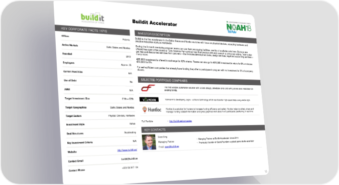 Buildit Accelerator KEY CORPORATE FACTS / KPIS INVESTOR DESCRIPTION Offices Estonia Buildit is the first accelerator in the Baltic States and Nordic countries with focus on physical devices, accepting hardware and creative industries startups worldwide. Active Markets Baltic States and Nordics During the 3 month mentoring program teams can use their prototyping facilities, see list of available tools here. Startups are offered free open office space at Tartu Science Park and can test their product with end-users in a Living Lab setting. Teams also get free and discounted services from partners – that includes development tools, design services, legal and accounting services + Founded 2013 many more. €25,000 investment is offered in exchange for 12% shares. Teams can also go for €15,000 investment in return for 9% or choose €10,000 for 6%. Employees Approx. 35 For self-sufficient companies that already have funding they offer to participate in program with no investment for 3% of company shares. Current Fund Size N/A Use of Debt No SELECTED PORTFOLIO COMPANIES The first window automation solution with a sleek design, affordable price and with just one-click installation on AUM N/A existing blinds. Target Investment Size €10k – €25k Velmenni is developing Jugnu - a future technology which can transfer high speed data using visible light. Target Geographies Baltic States and Nordics Huntloc is a solution for hunters to increase hunting efficiency and safety. Huntloc helps to collect, share and manage hunting related information and gives graphical view about hunt participants positioning in real time. Target Sectors Physical Devices, Hardware Investment Style Active Full Portfolio • http://buildit.ee/companies Deal Structures Accelerating KEY CONTACTS Sven Illing Key Investment Criteria N/A Managing Partner • Manging Partner at Buildit Accelerator since 2014 • Previously founder of GameFounders a global game studio accerlator Website http://www.buildit.ee/ Email: [email protected] Contact Email [email protected] Contact Phone +372 53 317 134 15