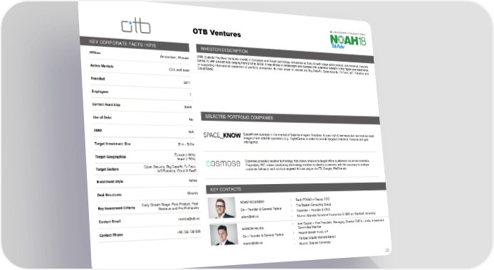 OTB Ventures KEY CORPORATE FACTS / KPIS INVESTOR DESCRIPTION Offices Amsterdam, Warsaw OTB(Outside The Box) Ventures invests in European and Israeli technology companies at Early Growth stage (post-product, post-revenue, typically Series A) with a ticket size ranging from $1M to $10M. It has offices in Amsterdam and Warsaw with extensive network in the region and experience in supporting international expansion of portfolio companies. Its main areas of interest are Big Data/AI, Cybersecurity, FinTech, IoT, Robotics and Active Markets CEE and Israel Cloud/SaaS. Founded 2017 Employees 7 Current Fund Size $53m Use of Debt No SELECTED PORTFOLIO COMPANIES AUM N/A SpaceKnowoperates in the market of Satellite Imagery Analytics. It uses high & low resolution commercial (raw) imagery from satellite operators (e.g. DigitalGlobe) in order to provide targeted industrial, financial and geo Target Investment Size $1m-$10m intelligence. Target Geographies Europe (~80%) Israel (~20%) Cosmoseprovides location technology that allows retailers to target offline customers via online channels. Target Sectors Cyber Security, Big Data/AI, FinTech, Proprietary WiFi indoor positioning technology enables to identify customers with 2m accuracy to analyze IoT/Robotics, Cloud & SaaS customer behavior and conduct targeted Ad campaigns via FB, Google, WeChat etc. Investment Style Active Deal Structures Minority KEY CONTACTS Key Investment Criteria Early Growth Stage: Post-Product, Post- ADAM NIEWINSKI • Bank PEKAO – Deputy CEO Revenue and Pre-Profitability [Photo] Co – Founder & General Partner • The Boston Consulting Group • Expander – Founder & CEO Contact Email monika@otb.vc adam@otb.vc • Alumni: Warsaw School of Economics & GSB on Stanford University Contact Phone +48 726 730 035 MARCIN HEJKA • Intel Capital – Vice President, Managing Director EMEA + India, Investment Committee Member [Photo] Co – Founder & General Partner • Poland Growth Fund, VP marcin@otb.vc • Paribas Capital Markets/Banexi • Alumni: Gdansk University 29