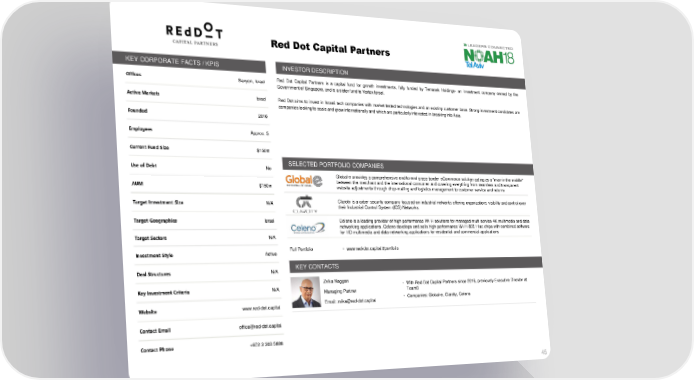 RedDotCapital Partners KEY CORPORATE FACTS / KPIS INVESTOR DESCRIPTION Offices Savyon, Israel Red Dot Capital Partners is a capital fund for growth investments, fully funded by Temasek Holdings- an investment company owned by the GovernmentofSingapore,andisasisterfundtoVertexIsrael. Active Markets Israel Red Dot aims to invest in Israeli tech companies with market tested technologies and an existing customer base. Strong investment candidates are companieslookingto scaleandgrow internationallyandwhich are particularlyinterestedin breakinginto Asia. Founded 2016 Employees Approx. 5 Current Fund Size $150m Use of Debt No SELECTED PORTFOLIO COMPANIES Global-e provides a comprehensive end-to-end cross-border eCommerce solution acting as a "man-in-the-middle" AUM $150m between the merchant and the international consumer and covering everything from seamless and transparent website adjustments through drop-mailing and logistics management to customer service and returns Target Investment Size N/A Claroty is a cyber security company focused on industrial networks offering organizations visibility and control over their Industrial Control System (ICS) Networks. Target Geographies Israel Celeno is a leading provider of high-performance Wi-Fi solutions for managed multi-service 4K multimedia and data networking applications. Celeno develops and sells high-performance Wi-Fi 802.11ac chips with combined software Target Sectors N/A for HD multimedia and data networking applications for residential and commercial applications Investment Style Active Full Portfolio • www.red-dot.capital/#portfolio Deal Structures N/A KEY CONTACTS Zvika Naggan • With Red Dot Capital Partners since 2016, previously Executive Director at Key Investment Criteria N/A Managing Partner Team8 Email: [email protected] • Companies: Global-e, Claroty, Celeno Website www.red-dot.capital Contact Email [email protected] Contact Phone +972 3 303 5888 45