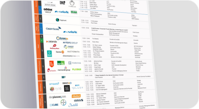 MAIN STAGE - Day 2 9 June 2016 SESSION TITLE COMPANY TIME SPEAKER POSITION COMPANY Breakfast 9:00 - 9:35 K 9:35 - 9:50 Day 1 Summary ® Marco Rodzynek Founder & CEO NOAH Advisors CP 9:50 - 10:00 Michael Gross Vice Chairman WeWork 10:00 - 10:20 Winners Make Winners - The Strong Performance of Interhyp with ING 1:1 Ralph Hamers CEO ING Group Fintech Michiel Goris CEO Interhyp 10:20 - 10:40 Olaf Koch Chairman of the Board of Management METRO Group 10:40 - 10:50 Olivier Marcheteau COO Vestiaire Collective 10:50 - 11:00 Jeff Lipkin CFO Harry’s CP 11:00 - 11:10 Robyn Ward Founder Mahtay 11:10 - 11:20 Fabian Siegel Founder & CEO Marley Spoon 11:20 - 11:30 Daniel Sobhani CEO Freeletics 11:30 - 11:40 Luke Waite Co-Founder Titan Black Consumer Goods 11:40 - 12:00 Herbert Hainer CEO Adidas 1:1 Florian Gschwandtner Co-Founder & CEO Runtastic ® Marco Rodzynek Founder & CEO NOAH Advisors 12:00 - 12:10 In discussion NOAH CP 12:10 - 12:20 Euan Davis Senior Director Cognizant op Picks T 12:20 - 12:30 Credit Suisse: Corporate Private Banking „connecting your wealth” Henrik Herr Head Germany & Austria International Credit Suisse NOAH 1:1 Wealth Management op Picks T Florian Gschwandtner Co-Founder & CEO Runtastic CP 12:30 - 12:40 Tim Stracke Founder & Co-CEO Chrono24 K 12:40 - 12:55 Rubin Ritter Member of the Management Board Zalando 12:55 - 13:05 Dr. Oliver Lederle Founder & CEO MYTOYS GROUP 13:05 - 13:15 Niklas Östberg Co-Founder & CEO Delivery Hero Retail Alexander Frolov Partner Target Global CP 13:15 - 13:25 Dr. Philipp Kreibohm Co-Founder Home24 13:25 - 13:35 Thierry Petit Founder & CEO Showroomprivee 13:35 - 13:45 Philip Rooke CEO Spreadshirt 13:45 - 13:55 Susanne Zacke Member of the Board Auctionata 13:55 - 14:05 Johannes Reck Founder & Co-CEO GetYourGuide Bo Ilsoe Partner Nokia Growth Partners ourism 14:05 - 14:15 Glenn Fogel EVP, Corporate Development Priceline Group CP 14:15 - 14:25 Hugo Burge CEO Momondo ravel & T 14:25 - 14:35 Joachim Hunold Founder Air Berlin T 14:35 - 14:45 Jochen Engert Founder & Managing Director FlixBus 14:45 - 14:55 7 Steps Needed for the Internet Economy in Europe CP Clark Parsons CEO Internet Economy Foundation 14:55 - 15:05 Ragnar Kruse CEO Smaato 15:05 - 15:15 Zvika Netter Co-Founder & CEO Innovid CP 15:15 - 15:25 Dr. Jürgen Galler Co-Founder & CEO 1plusX AG Advertising 15:25 - 15:35 Tim Schumacher Chairman Eyeo 15:35 - 15:45 Carl Erik Kjærsgaard Executive Chairman and Co-Founder Blackwood Seven 15:45 - 15:55 Mariusz Gralewski CEO DocPlanner e, 15:55 - 16:05 Markus Witte CEO Babbel 16:05 - 16:10 Dr. Torsten Oelke Executive Chairman CUBE CP 16:10 - 16:20 Jessica Federer Head of Digital Development Bayer Healthcar 16:20 - 16:30 Dr. Friedrich Schwandt Founder & CEO Statista Science & Education 16:30 - 16:40 Stanislas Niox-Chateau Co-Founder & CEO Doctolib 16:40 - 16:50 Christian Mylius Managing Partner Innovalue Management Advisors 1:1 Julian Teicke Founder & CEO FinanceFox Fintech 16:50 - 17:00 Polina Montano COO JobToday 17:00 - 17:10 Klaas Kersting Founder & CEO flaregames 17:10 - 17:20 Hermione McKee Head of Finance Wooga , Media 17:20 - 17:30 Hanna Aase CEO Wonderloop esentation 17:30 - 17:40 Christian Sauer CEO Webtrekk & Gaming 17:40 - 17:50 Nora-Vanessa Wohlert Founder EDITION F Susann Hoffmann Founder EDITION F echnology 17:50 - 18:00 Peter Würtenberger CEO upday T Company Pr 18:00 - 18:10 Eric Leandri Co-Founder & CEO Qwant 18:10 - 18:20 Lucas von Cranach Co-Founder & CEO Onefootball K 18:20 - 18:40 What NOAH is Working On For You! An Outlook Into the Next 3 Years ® Marco Rodzynek Founder & CEO NOAH Advisors Departing Drinks & Network Snacks 18:40 - 19:40 K Keynote CP Company Presentation FC Fireside Chat P Panel