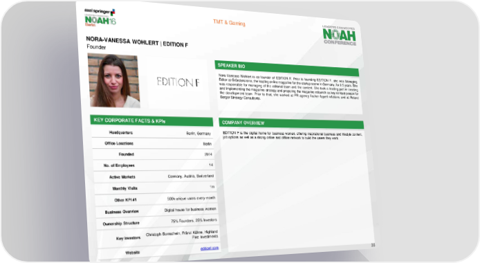 TMT & Gaming NORA-VANESSA WOHLERT | EDITIONF Founder SPEAKER BIO Nora-Vanessa Wohlert is co-founder of EDITION F. Prior to founding EDITION F, she was Managing Editor at Gründerszene, the leading online magazine for the startup scene in Germany, for 2.5 years. She was responsible for managing of the editorial team and the content. She took a leading part in creating and implementing the magazine strategy and preparing the magazine relaunch as key contact person for the development team. Prior to that, she worked at PR agency fischer-Appelt relations and at Roland Berger Strategy Consultants. KEY CORPORATE FACTS & KPIs COMPANY OVERVIEW Headquarters Berlin, Germany EDITION F is the digital home for business women, offering inspirational business and lifestyle content, job options as well as a strong online and offline network to build the career they want. Office Locations Berlin Founded 2014 No. of Employees 14 Active Markets Germany, Austria, Switzerland Monthly Visits 1m Other KPI #1 500k unique users every month Business Overview Digital house for business women Ownership Structure 75% Founders, 25% Investors Key Investors Christoph Bornschein, Fränzi Kühne, Highland Pine Investments Website editionf.com 35