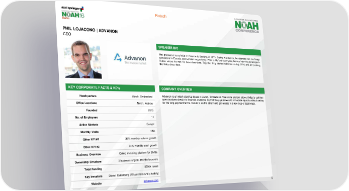 Fintech PHIL LOJACONO | ADVANON CEO SPEAKER BIO Phil graduated as a MSc in Finance & Banking in 2015. During his studies, he attended two exchange semesters in Canada and London respectively. Prior to his last study year, he was interning at Google in Dublin where he met his two-cofounders. Together they started Advanon in July 2016 and are pushing the limits since then. KEY CORPORATE FACTS & KPIs COMPANY OVERVIEW Headquarters Zürich, Switzerland Advanon is a fintech start-Up based in Zurich, Switzerland. The online platform allows SMEs to sell their open invoices directly to financial investors. By that they get access to immediate liquidity without waiting Office Locations Zürich, Krakow for the long payment terms. Investors on the other hand get access to a new type of asset-class. Founded 2015 No. of Employees 11 Active Markets Europe Monthly Visits 4.5k Other KPI #1 38% monthly volume growth Other KPI #2 31% monthly user growth Business Overview Online invoicing platform for SMBs Ownership Structure 3 business angels and the founders Total Funding $500k raised Key Investors Daniel Gutenberg (iVI partners and privately) Website advanon.com 5