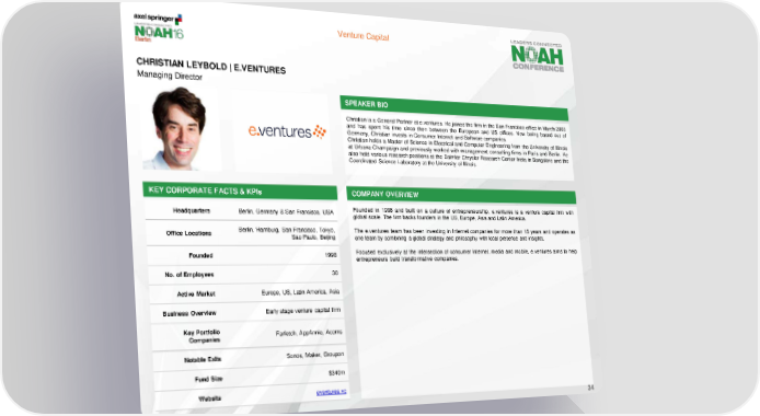 Venture Capital CHRISTIAN LEYBOLD | E.VENTURES Managing Director SPEAKER BIO Christian is a General Partner at e.ventures. He joined the firm in the San Francisco office in March 2003 and has spent his time since then between the European and US offices. Now being based out of Germany, Christian invests in Consumer Internet and Software companies. Christian holds a Master of Science in Electrical and Computer Engineering from the University of Illinois at Urbana-Champaign and previously worked with management consulting firms in Paris and Berlin. He also held various research positions at the Daimler Chrysler Research Center India in Bangalore and the Coordinated Science Laboratory at the University of Illinois. KEY CORPORATE FACTS & KPIs COMPANY OVERVIEW Headquarters Berlin, Germany & San Francisco, USA Founded in 1998 and built on a culture of entrepreneurship, e.ventures is a venture capital firm with global scale. The firm backs founders in the US, Europe, Asia and Latin America. Office Locations Berlin. Hamburg, San Francisco, Tokyo, The e.ventures team has been investing in Internet companies for more than 15 years and operates as Sao Paulo, Beijing one team by combining a global strategy and philosophy with local presence and insights. Founded 1998 Focused exclusively at the intersection of consumer Internet, media and mobile, e.ventures aims to help entrepreneurs build transformative companies. No. of Employees 30 Active Market Europe, US, Latin America, Asia Business Overview Early stage venture capital firm Key Portfolio Farfetch, AppAnnie, Acorns Companies Notable Exits Sonos, Maker, Groupon Fund Size $340m Website eventures.vc 34