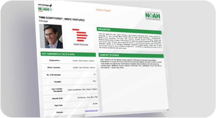 Venture Capital TIMM SCHIPPOREIT | INDEX VENTURES Principal SPEAKER BIO Timm has spent his entire career working in the European technology sector, having advised tech companies on more than $20 billion of M&A, IPO and capital raising transactions – including Adyen, Alcatel-Lucent, Autotrader, First Data, SAP, Siemens, Scout24, Supercell, Worldpay, Yandex and Zalando among others. At Index, Timm focuses on venture and growth investments in the DACH region and across Europe. His prior career experience includes 11 years at Morgan Stanley, most recently as an executive director in the European technology investment banking practice. Timm sees a future increasingly shaped by young ambitious entrepreneurs – and believes supporting them today is one of the smartest investments that can be made. KEY CORPORATE FACTS & KPIs COMPANY OVERVIEW Headquarters London, San Francisco, Geneva Index Ventures is an international venture capital firm that backs the best and most ambitious entrepreneurs in Europe, the US and Israel, across all company stages, from seed to venture to growth. These leaders are building truly transformative companies that are reshaping the world around us, including Adyen, BlaBlaCar, Dropbox, Deliveroo, Dubsmash, King, Squarespace, Sonos, SoundCloud Office Locations London, San Francisco, Geneva and Supercell – among many others. No. of Employees 58 Founded 1996 Key Portfolio Criteo, Soundcloud, Asos, Skype, Dropbox Companies Notable Exits Onefinestay, King, Etsy, Path Fund Size $5.8bn Website indexventures.com 53