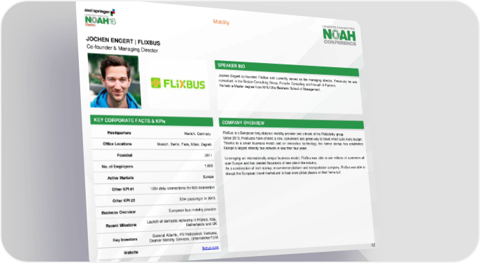 Mobility JOCHEN ENGERT | FLIXBUS Co-founder & Managing Director SPEAKER BIO Jochen Engert co-founded FlixBus and currently serves as the managing director. Previously he was consultant in the Boston Consulting Group, Porsche Consulting and Horvath & Partners. Heheld a Master degree from WHUOtto Beisheim School of Management. KEY CORPORATE FACTS & KPIs COMPANY OVERVIEW Headquarters Munich, Germany FlixBus is a European long distance mobility provider and a brand of the FlixMobility group. Since 2013, FlixBuses have offered a new, convenient and green way to travel which suits every budget. Office Locations Munich, Berlin, Paris, Milan, Zagreb Thanks to a smart business model and an innovative technology, the former startup has established Europe’s largest intercity bus network in less than four years. Founded 2011 Leveraging an internationally unique business model, FlixBus was able to win millions of customers all No. of Employees 1,000 over Europe and has created thousands of new jobs in the industry. Asa combination of tech-startup, e-commerce-platform and transportation company, FlixBus was able to Active Markets Europe disrupt the European travel market and to beat even global players on their home turf. Other KPI #1 100k daily connections for 800 destination Other KPI #2 20m passenger in 2015 Business Overview European bus mobility provider Recent Milestone Launch of domestic networks in France, Italy, Netherlands and UK Key Investors General Atlantic, HV Holtzbrinck Ventures, Daimler Mobility Services, UnternehmerTUM Website flixbus.com 42