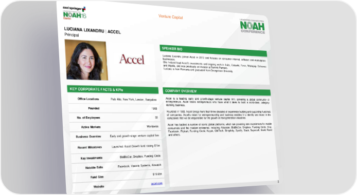 Venture Capital LUCIANA LIXANDRU | ACCEL Principal SPEAKER BIO Luciana Lixandru joined Accel in 2012 and focuses on consumer internet, software and marketplace businesses. She helped lead Accel’s investments and ongoing work in Avito, Catawiki, Fever, Wallapop, Deliveroo and Algolia, and was previously an investor at Summit Partners. Luciana is from Romania and graduated from Georgetown University. KEY CORPORATE FACTS & KPIs COMPANY OVERVIEW Office Locations Palo Alto, New York, London, Bangalore Accel is a leading early and growth-stage venture capital firm, powering a global community of entrepreneurs. Accel backs entrepreneurs who have what it takes to build a world-class, category- defining business. Founded 1983 Founded in 1983, Accel brings more than three decades of experience building and supporting hundreds No. of Employees 52 of companies. Accel's vision for entrepreneurship and business enables it to identify and invest in the companies that will be responsible for the growth of next-generation industries. Active Markets Worldwide Accel has backed a number of iconic global platforms, which are powering new experiences for mobile consumers and the modern enterprise, including Atlassian, BlaBlaCar, Dropbox, Funding Circle, Etsy, Facebook, Flipkart, Funding Circle, Kayak, QlikTech, Simplivity, Spotify, Slack, Supercell, World Remit Business Overview Early and growth-stage venture capital firm and others. Recent Milestones Launched Accel Growth fund raising $1bn Key Investments BlaBlaCar, Dropbox, Funding Circle Notable Exits Facebook, Varonis Systems, Airwatch Fund Size $19.6bn Website accel.com 3