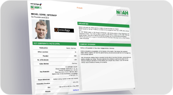 Fintech MICHEL GORIS | INTERHYP Co-Founder and CEO SPEAKER BIO Michiel is 49 years old, married and has 3 children. He and his family live in Munich. Michiel started at Interhyp in 2008 as a member of the management board and is CEO since January 2011. In 1997 Michiel started at ING Group in Amsterdam, after having worked at Price Waterhouse and Bertelsmann before. From 2002 to 2006 he worked for ING-DiBa in Frankfurt as CFO, CRO, COO and board member. From 2007 to 2008 he was general manager and CFO at ING Direct in Amsterdam. Michiel graduated with a degree in Economics from the University of Groningen and is a Dutch Certified Public Accountant. KEY CORPORATE FACTS & KPIs COMPANY OVERVIEW Headquarters Munich, Germany Interhyp is the specialist for the private mortgage lending in Germany. Office Locations 95 Interhyp consultants are specialists for the financing of the property. They analyze their customers' needs, develop together with them the optimal financing structure and look after them from the beginning to the punctual payment. Founded 1999 Here, the personal Interhyp finance consultant from the offer of more than 300 banks, savings banks and No. of Employees 1,300 building societies can choose. This gives customers the confidence to get the right solution for him. Because Interhype specializes in home financing and compare many vendors, it can offer the best Active Markets Germany interest rates for individual financing of the property. EV estimated: $650m Closed mortgage volume 2015: 16.1 bn Key Financials Number of contracts 2015: 92,448 Revenues 2015: €167m, EBITDA: €60m Market share of new businesses of mortgages in Germany: 6% Recent Milestones $500m funding rounds to enter new markets Ownership Structure 100% ING Exit Sale to ING for €416m in May 2008 Website interhyp.de 57