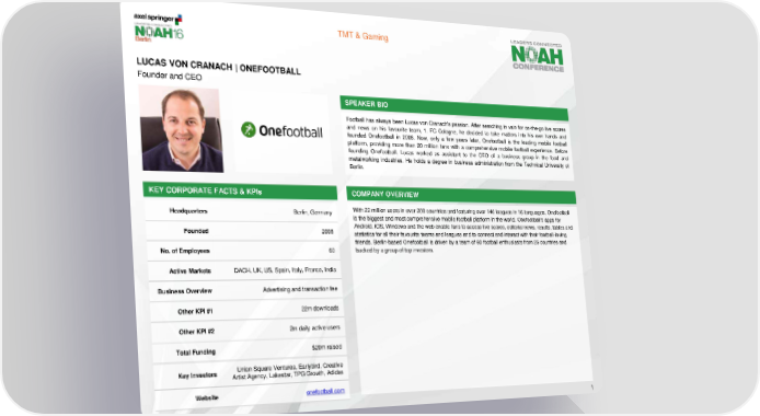 TMT & Gaming LUCAS VON CRANACH | ONEFOOTBALL Founder and CEO SPEAKER BIO Football has always been Lucas von Cranach's passion. After searching in vain for on-the-go live scores and news on his favourite team, 1. FC Cologne, he decided to take matters into his own hands and founded Onefootball in 2008. Now, only a few years later, Onefootball is the leading mobile football platform, providing more than 20 million fans with a comprehensive mobile football experience. Before founding Onefootball, Lucas worked as assistant to the CEO of a business group in the food and metalworking industries. He holds a degree in business administration from the Technical University of Berlin. KEY CORPORATE FACTS & KPIs COMPANY OVERVIEW Headquarters Berlin, Germany With 22 million users in over 200 countries and featuring over 140 leagues in 16 languages, Onefootball is the biggest and most comprehensive mobile football platform in the world. Onefootball’s apps for Founded 2008 Android, iOS, Windows and the web enable fans to access live scores, editorial news, results, tables and statistics for all their favourite teams and leagues and to connect and interact with their football-loving friends. Berlin-based Onefootball is driven by a team of 60 football enthusiasts from 25 countries and No. of Employees 60 backed by a group of top investors. Active Markets DACH, UK, US, Spain, Italy, France, India Business Overview Advertising and transaction fee Other KPI #1 22m downloads Other KPI #2 2m daily active users Total Funding $20m raised Key Investors Union Square Ventures, Earlybird, Creative Artist Agency, Lakestar, TPG Growth, Adidas Website onefootball.com 1