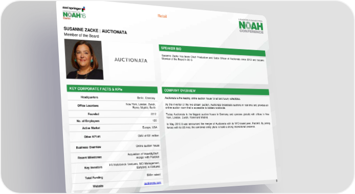 Retail SUSANNE ZACKE | AUCTIONATA Memberof the Board SPEAKER BIO Susanne Zacke has been Chief Production and Sales Officer of Auctionata since 2012 and became Memberof the Board in 2013. KEY CORPORATE FACTS & KPIs COMPANY OVERVIEW Headquarters Berlin, Germany Auctionata is the leading online auction house for art and luxury collectibles. Office Locations New York, London, Zurich, As the inventor of the live stream auction, Auctionata broadcasts auctions in real-time and provides an Rome, Madrid, Berlin online auction room that is accessible to bidders worldwide. Founded 2012 Today Auctionata is the biggest auction house in Germany and operates globally with offices in New York, London, Zurich, Rome and Madrid. No. of Employees 120 In May 2016 it was announced the merger of Auctionata with its NYC-based peer, Paddle8. By joining Active Market Europe, USA forces with its US rival, the combined entity plans to build a strong international presence. Other KPI #1 GMV of €81 million Business Overview Online auction house Recent Milestones Acquisition of ValueMyStuff; merger with Paddle8 Key Investors HV Holtzbrinck Ventures, MCI Management, Earlybird, e.Ventures Total Funding $96m raised Website auctionata.com 9