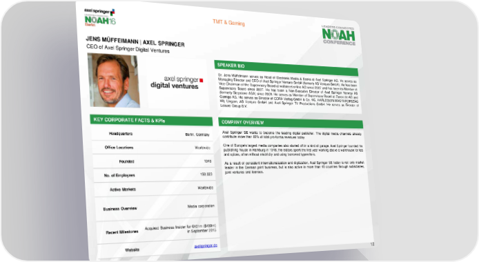 TMT & Gaming JENS MÜFFEIMANN | AXEL SPRINGER CEO of Axel Springer Digital Ventures SPEAKER BIO Dr. Jens Müffelmann serves as Head of Electronic Media & Books at Axel Springer AG. He serves as Managing Director and CEO of Axel Springer Venture GmbH (formerly AS Venture GmbH). He has been Vice Chairman of the Supervisory Board at wallstreet online AG since 2007 and has been its Member of Supervisory Board since 2007. He has been a Non-Executive Director of Axel Springer Norway AS (formerly Stepstone ASA) since 2009. He serves as Member of Supervisory Board at Zanox.de AG and Gamigo AG. He serves as Director of CORA Verlag GmbH & Co. KG, HARLEQUIN MAGYARORSZÁG Kft, Ungarn, AS Venture GmbH and Axel Springer TV Productions GmbH. He serves as Director of Leisure Group B.V. KEY CORPORATE FACTS & KPIs COMPANY OVERVIEW Headquarters Berlin, Germany Axel Springer SE wants to become the leading digital publisher. The digital media channels already contribute more than 60% of total pro-forma revenues today. Office Locations Worldwide One of Europe's largest media companies also started off in a kind of garage. Axel Springer founded his publishing house in Hamburg in 1946; the editors spent the first year working above a warehouse for tea and spices, often without electricity and using borrowed typewriters. Founded 1946 As a result of consistent internationalization and digitization, Axel Springer SE today is not only market leader in the German print business, but is also active in more than 40 countries through subsidiaries, No. of Employees 150,023 joint ventures and licenses. Active Markets Worldwide Business Overview Media corporation Recent Milestones Acquired Business Insider for €401m ($450m) in September 2015 Website axelspringer.de 12