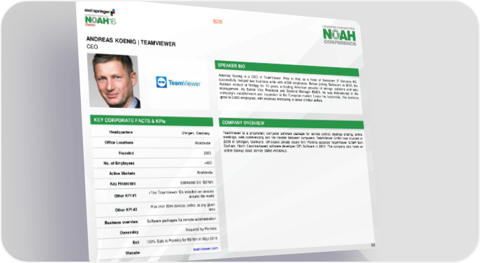 B2B ANDREAS KOENIG | TEAMVIEWER CEO SPEAKER BIO Andreas Koenig is a CEO of TeamViewer. Prior to that, as a Head of Swisscom IT Services AG, successfully merged two business units with 4,500 employees. Before joining Swisscom in 2012, the Austrian worked at NetApp for 16 years, a leading American provider of storage solutions and data management. As Senior Vice President and General Manager EMEA, he was instrumental in the company's establishment and expansion in the European market. Under his leadership, this business grew to 2,000 employees, with revenues increasing to about 2 billion dollars. KEY CORPORATE FACTS & KPIs COMPANY OVERVIEW Headquarters Uhingen, Germany TeamViewer is a proprietary computer software package for remote control, desktop sharing, online meetings, web conferencing and file transfer between computers. TeamViewer GmbH was founded in Office Locations Worldwide 2005 in Uhingen, Germany. UK-based private equity firm Permira acquired TeamViewer GmbH from Durham, North Carolina-based software developer GFI Software in 2014. The company also hosts an Founded 2005 online backup cloud service called Airbackup. No. of Employees >600 Active Markets Worldwide Key Financials Estimated EV: $975m Other KPI #1 +1bn TeamViewer IDs installed on devices around the world Other KPI #2 Has over 20m devices online at any given time Business overview Software packages for remote administration Ownership Acquired by Permira Exit 100% Sale to Permira for €870m in May 2014 Website teamviewer.com 98
