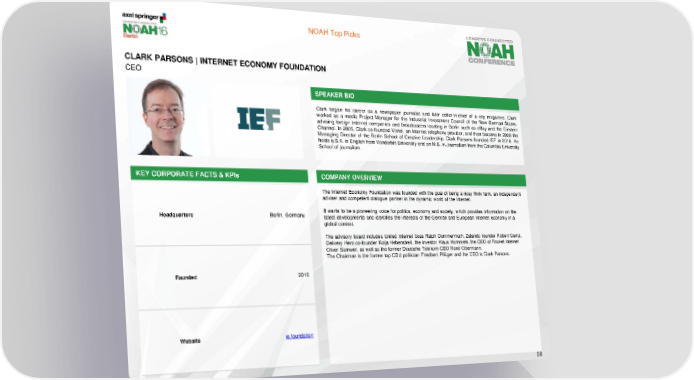 NOAH Top Picks CLARK PARSONS | INTERNET ECONOMY FOUNDATION CEO SPEAKER BIO Clark began his career as a newspaper journalist and later editor-in-chief of a city magazine. Clark worked as a media Project Manager for the Industrial Investment Council of the New German States, advising foreign Internet companies and broadcasters locating in Berlin such as eBay and the Einstein Channel. In 2005, Clark co-founded Vortel, an Internet telephony provider, and then became in 2008 the Managing Director of the Berlin School of Creative Leadership. Clark Parsons founded IEF in 2016. He holds a B.A. in English from Vanderbilt University and an M.S. in Journalism from the Columbia University School of journalism. KEY CORPORATE FACTS & KPIs COMPANY OVERVIEW The Internet Economy Foundation was founded with the goal of being a nosy think tank, an independent adviser and competent dialogue partner in the dynamic world of the Internet. Headquarters Berlin, Germany It wants to be a pioneering voice for politics, economy and society, which provides information on the latest developments and identifies the interests of the German and European Internet economy in a global context. The advisory board includes United Internet boss Ralph Dommermuth, Zalando founder Robert Gentz, Delivery Hero co-founder Kolja Hebenstreit, the investor Klaus Hommels, the CEO of Rocket Internet Oliver Samwer, as well as the former Deutsche Telekom CEO René Obermann. The Chairman is the former top CDU politician Friedbert Pflüger and the CEO is Clark Parsons. Founded 2016 Website ie.foundation 58