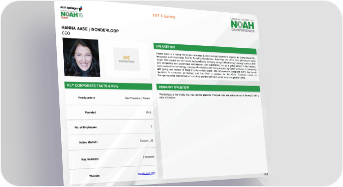 TMT & Gaming HANNA AASE | WONDERLOOP CEO SPEAKER BIO Hanna Aase is a native Norwegian who has studied multiple Bachelor’s degrees in Entrepreneurship, Innovation and Leadership. Prior to founding Wonderloop, Aase was one of the early pioneers in social media. She started her own social media advisory company at age 24 that brought steady business from 200 companies and government departments and establishing her as a global expert in the industry. Aase created the technology company Wonderloop after being inspired by Oprah’s mission of connecting and giving and wanted to bring it to the mobile space. She is known for being one of the few female founders in consumer technology and has been a speaker for the World Economic Forum on Entrepreneurship and SXSWon how video-profiles can have social impact on people’s lives. KEY CORPORATE FACTS & KPIs COMPANY OVERVIEW Wonderloop is the worlds first video-profile platform. The goal is to see every person in the world with a Headquarters San Francisco / Poland click of a button. Founded 2013 No. of Employees 5 Active Markets Europe / US Key Investors 8 investors Website wonderloop.com 109