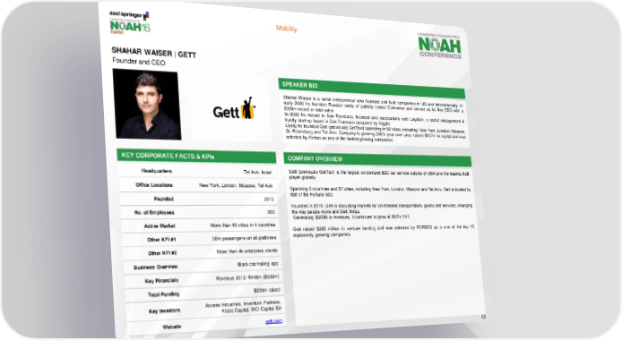 Mobility SHAHAR WAISER | GETT Founder and CEO SPEAKER BIO Shahar Waiser is a serial entrepreneur who founded and built companies in US and Internationally. In early 2000 he founded Russian entity of publicly traded Comverse and served as its first CEO with a $300m record in total sales. In 2005 he moved to San Francisco, founded and successfully sold Loyalize, a social engagement & loyalty start-up based in San Francisco (acquired by Viggle). Lately he founded Gett (previously GetTaxi) operating in 52 cities, including: New York, London, Moscow, St. Petersburg and Tel Aviv. Company is growing 300% year over year, raised $207m in capital and was selected by Forbes as one of the fastest growing companies. KEY CORPORATE FACTS & KPIs COMPANY OVERVIEW Headquarters Tel Aviv, Israel Gett (previously GetTaxi) is the largest on-demand B2C car service outside of USA and the leading B2B player globally. Office Locations New York, London, Moscow, Tel Aviv Spanning 5 countries and 57 cities, including New York, London, Moscow and Tel Aviv, Gett is trusted by Founded 2010 half of the Fortune 500. Founded in 2010, Gett is disrupting markets for on-demand transportation, goods and services, changing No. of Employees 500 the way people move and Gett things. Generating $500M in revenues, it continues to grow at 300% YoY. Active Market More than 60 cities in 4 countries Gett raised $220 million in venture funding and was selected by FORBES as a one of the top 15 Other KPI #1 50m passengers on all platforms explosively growing companies. Other KPI #2 More than 4k enterprise clients Business Overview Black car hailing app Key Financials Revenue 2015: €446m ($500m) Total Funding $220m raised Key Investors Access Industries, Inventure Partners, Kreos Capital, MCI Capital SA Website gett.com 45