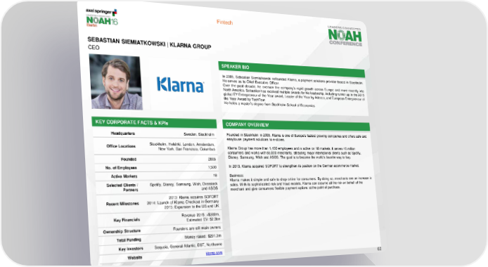 Fintech SEBASTIAN SIEMIATKOWSKI | KLARNA GROUP CEO SPEAKER BIO In 2005, Sebastian Siemiatkowski cofounded Klarna, a payment solutions provider based in Stockholm. Heserves as its Chief Executive Officer. Over the past decade, he oversaw the company’s rapid growth across Europe and more recently into North America. Sebastian has received multiple awards for his leadership, including runner up in the 2015 global EY Entrepreneur of the Year award, Leader of the Year by Adecco, and European Entrepreneur of the Year Award by TechTour. Heholds a master’s degree from Stockholm School of Economics. KEY CORPORATE FACTS & KPIs COMPANY OVERVIEW Headquarters Sweden, Stockholm Founded in Stockholm in 2005, Klarna is one of Europe's fastest growing companies and offers safe and easytouse payment solutions to e-stores. Office Locations Stockholm, Helsinki, London, Amsterdam, Klarna Group has more than 1,400 employees and is active on 18 markets. It serves 45 million New York, San Francisco, Columbus consumers and works with 65,000 merchants, attracting major international clients such as Spotify, Founded 2005 Disney, Samsung, Wish and ASOS. The goal is to become the world’s favorite way to buy. No. of Employees 1,500 In 2013, Klarna acquired SOFORT to strengthen its position on the German ecommerce market. Active Markets 18 Business: Selected Clients / Spotify, Disney, Samsung, Wish, Overstock Klarna makes it simple and safe to shop online for consumers. By doing so, merchants see an increase in Partners and ASOS sales. With its sophisticated risk and fraud models, Klarna can assume all the risk on behalf of the merchant and give consumers flexible payment options at the point of purchase. 2013: Klarna acquires SOFORT Recent Milestones 2014: Launch of Klarna Checkout in Germany 2015: Expansion to the US and UK Key Financials Revenue 2015: +$300m, Estimated EV: $2.3bn Ownership Structure Founders are still main owners Total Funding Money raised: $291.3m Key Investors Sequoia, General Atlantic, DST, Northzone Website klarna.com 62