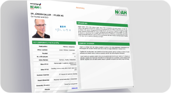 Advertising DR. JÜRGEN GALLER | 1PLUSX AG Co-Founder and CEO SPEAKER BIO Jürgen Galler, CEO of the startup 1plusX, has a PhD in economics and social science. He has held various international management positions in his professional career. Before joining Swisscom, he was in charge of the product management for Google Search and Consumer Products in Europe until 2009, before assuming responsibility for product management and engineering for YouTube EMEA. As an MD, he played an instrumental role in setting up the Asian business of IDS Scheer in South Korea and Japan before joining Bertelsmann in 2000 as VP of Lycos Europe and MD of Social & Communication Products. In the latter role he worked in Germany and Spain. KEY CORPORATE FACTS & KPIs COMPANY OVERVIEW Headquarters Pfäffikon, Switzerland 1plusX is a Swiss high tech startup founded by some of the most experienced entrepreneurs and technologists the European Internet scene has to offer (ex Google, Bertelsmann, Swisscom, etc.). Office Locations Zürich, Pfaffikon, Switzerland Together the founding team has invented and launched products used by hundreds of millions of users Founded 2014 worldwide and already started numerous successful internet/ high tech companies themselves. No. of Employees 15 1plusX builds and operates systems that use very general data from the web, mobile or TV networks to calculate valuable and meaningful information for a broad spectrum of customers. 1plusX employs highly Active Markets Germany, Austria, Switzerland talented engineers and use latest scientific results to generate competitive and leading edge technology. Other KPI #1 Market leader in audience predictions for Switzerland Other KPI #2 Doubling revenue every other month since last year Business Overview IT Products for audience tracking Recent Milestones Reached market leadership in Switzerland Ownership Structure Owned by management Website 1plusx.com 2