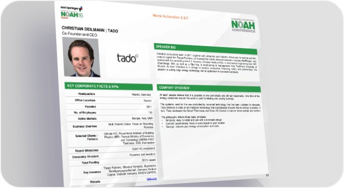 Home Automation & IoT CHRISTIAN DEILMANN| TADO Co-Founder and CEO SPEAKER BIO Christian co-founded tado° in 2011 together with Johannes and Valentin. Previously he worked with the venture capital firm Target Partners, co-founded the mobile telecommunication company BellPepper, and worked with the consulting firm A.T. Kearney. Christian holds a M.Sc. in mechanical engineering from MIT (Cambridge, MA) as well as a Dipl.-Ing. in engineering & management from Technical University of Munich. At tado° Christian is in charge of product, production, financing, sales, and partnerships. His passion is cutting edge energy technology and its application in successful products. KEY CORPORATE FACTS & KPIs COMPANY OVERVIEW Headquarters Munich, Germany At tado° people believe that it is possible to live comfortably and still act responsibly. One third of the energy consumed around the world is used for heating and cooling buildings. Office Locations Munich Founded 2011 The systems used for this are controlled by nonsmart technology that has been outdated for decades. Tado believes in state of art intelligent technology that automatically ensures that no energy is wasted. In No. of Employees 130 turn, Tado developed the Smart Thermostat and Smart AC Control to improve home savings and comfort. Active Markets Europe, Asia, USA The philosophy follows three basic principles: • Simplicity: easy to install and use with a minimalist design Business Overview Multi Channel Sales, Focus on Recurring • Comfort: automatically heats or cools based on your location Revenue • Savings: reduces your energy consumption and costs Selected Clients / Climate KIC, Frauenhofer Institute of Building Partners Physics (IBP), Federal Ministry of Economics and Technology (MBWi) AT&T Telefonica, SSE, Homeserve Recent Milestones €50m VC investment Ownership Structure Founders and investors Total Funding $57m raised Target Partners, Shortcut Ventures, Bayerische Key Investors Beteiligungsgesellschaft, Siemens Venture Capital, Statkraft Ventures, INVEN CAPITAL Website tado.com 95