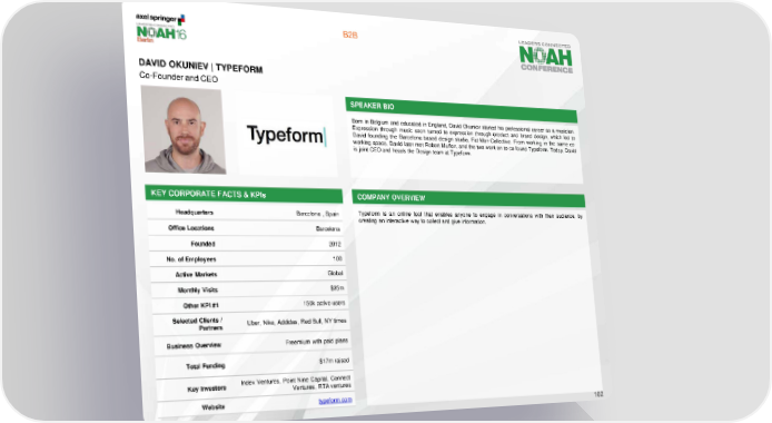 B2B DAVID OKUNIEV | TYPEFORM Co-Founder and CEO SPEAKER BIO Born in Belgium and educated in England, David Okuniev started his professional career as a musician. Expression through music soon turned to expression through product and brand design, which led to David founding the Barcelona-based design studio, Fat-Man-Collective. From working in the same co- working space, David later met Robert Muñoz, and the two went on to co-found Typeform. Today, David is joint CEO and heads the Design team at Typeform. KEY CORPORATE FACTS & KPIs COMPANY OVERVIEW Headquarters Barcelona , Spain Typeform is an online tool that enables anyone to engage in conversations with their audience, by creating an interactive way to collect and give information. Office Locations Barcelona Founded 2012 No. of Employees 100 Active Markets Global Monthly Visits $25m Other KPI #1 150k active users Selected Clients / Uber, Nike, Addidas, Red Bull, NY times Partners Business Overview Freemium with paid plans Total Funding $17m raised Key Investors Index Ventures, Point Nine Capital, Connect Ventures, RTA ventures Website typeform.com 102