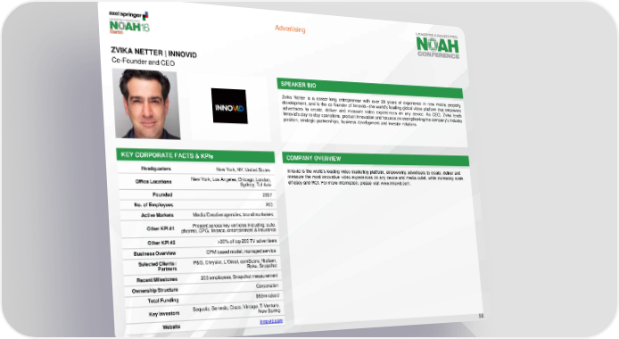 Advertising ZVIKA NETTER | INNOVID Co-Founder and CEO SPEAKER BIO Zvika Netter is a career-long entrepreneur with over 20 years of experience in new media property development, and is the co-founder of Innovid—the world’s leading global video platform that empowers advertisers to create, deliver and measure video experiences on any device. As CEO, Zvika leads Innovid’s day-to-day operations, product innovation and focuses on strengthening the company’s industry position, strategic partnerships, business development and investor relations. KEY CORPORATE FACTS & KPIs COMPANY OVERVIEW Headquarters New York, NY, United States Innovid is the world’s leading video marketing platform, empowering advertisers to create, deliver and New York, Los Angeles, Chicago, London, measure the most innovative video experiences on any device and media outlet, while increasing scale, Office Locations Sydney, Tel Aviv efficacy and ROI. For more information, please visit www.innovid.com. Founded 2007 No. of Employees 200 Active Markets Media/Creative agencies, brand marketers Other KPI #1 Presentacross key verticlesincluding: auto, pharma, CPG, finance, entertainment & insurance Other KPI #2 >30% oftop 200 TV advertisers Business Overview CPM based model, managed service Selected Clients / P&G, Chrysler, L’Oreal, comScore, Nielsen, Partners Roku, Snapchat Recent Milestones 200 employees, Snapchatmeasurement OwnershipStructure Corporation Total Funding $53mraised Key Investors Sequoia, Genesis, Cisco, Vintage, T-Venture, New Spring Website innovid.com 56