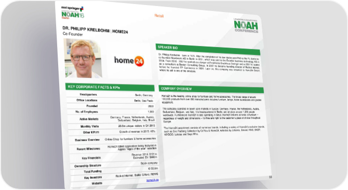 Retail DR. PHILIPP KRELBOHM | HOME24 Co-Founder SPEAKER BIO Dr. Philipp Kreibohm - born in 1976. After the completion of his law studies and PhD at the FU Berlin he co-founded Mundwerk AG in Berlin in 2001, which was sold to the Excelsis business technology AG in 2004. From 2006 - 2007 he worked as a lawyer at Freshfields Bruckhaus Deringer and in 2007 he started as a consultant at Boston Consulting Group. In 2007 he became founding director of Rocket Internet, before he founded FP Commerce in 2009. Later on, this company was renamed to Home24 GmbH, where he still is one of the directors. KEY CORPORATE FACTS & KPIs COMPANY OVERVIEW Headquarters Berlin, Germany Home24 is the leading online shop for furniture and home accessories. The broad range of around Office Locations Berlin, Sao Paolo 180,000 products from over 800 manufacturers includes furniture, lamps, home accessories and garden equipment. Founded 2009 The company operates in seven core markets in Europe: Germany, France, the Netherlands, Austria, No. of Employees 1,383 Switzerland, Belgium, and Italy. It is headquartered in Berlin, and employs around 1,200 people Germany, France, Netherlands, Austria, worldwide. Furthermore Home24 is also operating in Brazil. Home24 delivers all kinds of furniture – Active Markets Switzerland, Belgium, Italy, Brazil regardless of weight and dimensions – for free and right to the customer´s place of choice throughout Europe. Monthly Visits 20.6m unique visitors in Q4 2015 The Home24 assortment consists of numerous brands, including a variety of Home24’s exclusive brands, Other KPI #1 Growth of revenue in 2015: 46% such as Eva Padberg Collection by Ce’Nou & Home24, kollected by Johanna, Smood, KINX, SKØP, KiYDOO, Loistaa and Says Who. Business Overview Online-Shop for furniture & home accessories Recent Milestones Home24 tablet application being featured in Apples “Apps of the year” selection Key Financials Revenue 2014: $131m Estimated EV: $960m Ownership Structure Stock company Total Funding €155.9m Key Investors Rocket Internet, Baillie Gifford, REWE Website home24.de 50